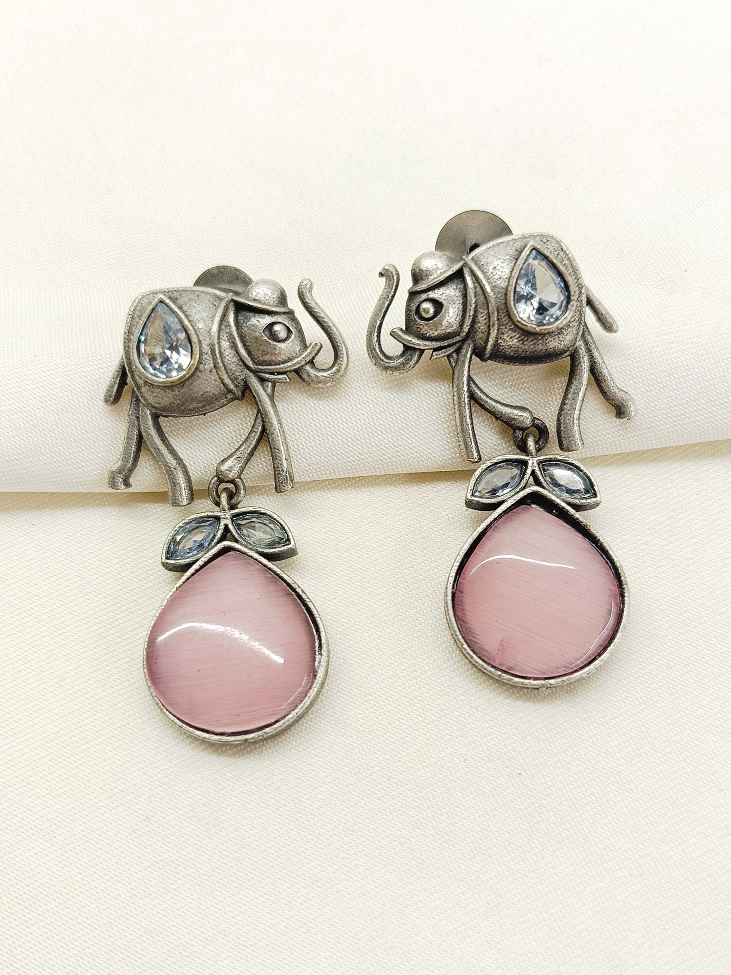 These Baby Pink Oxidized Earrings Feature An Elegant Elephant Design Crafted With Oxidized Silver Plating, Offering A Vintage-inspired Look. Accented With Semi-precious Stones, They Combine Traditional Artistry With Subtle Color, Making Them A Refined Choice For Those Who Appreciate Detailed Craftsmanship And Unique Style. Perfect For Adding A Distinctive Touch To Any Outfit.