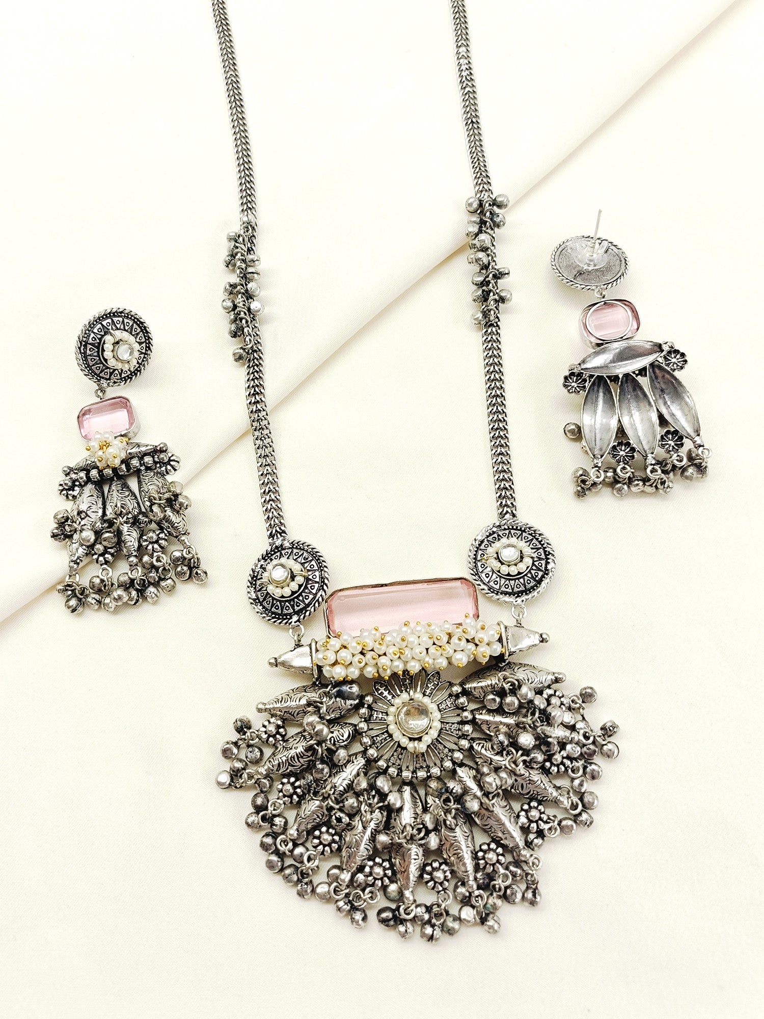 This Baby Pink Oxidized Pendant Set Features An Oxidized Silver-plated Brass Base, Elegantly Accented With Pearls And Adorned Stones For A Refined Look. The Addition Of Ghunghroo Enhances Its Traditional Charm, Making It A Perfect Accessory For Festive Occasions Or Ethnic Wear. Durable And Stylish, This Set Combines Classic Craftsmanship With Contemporary Design.