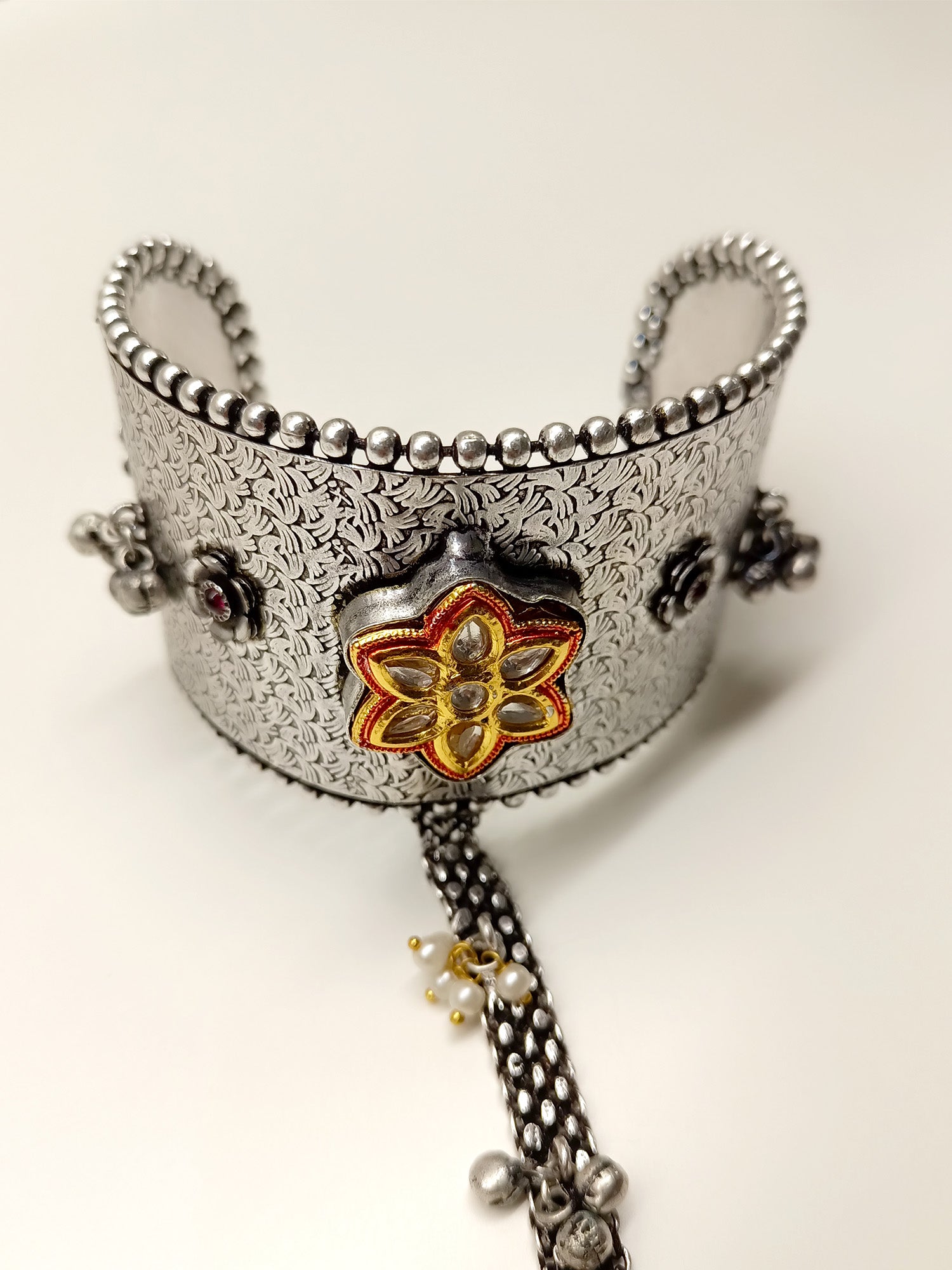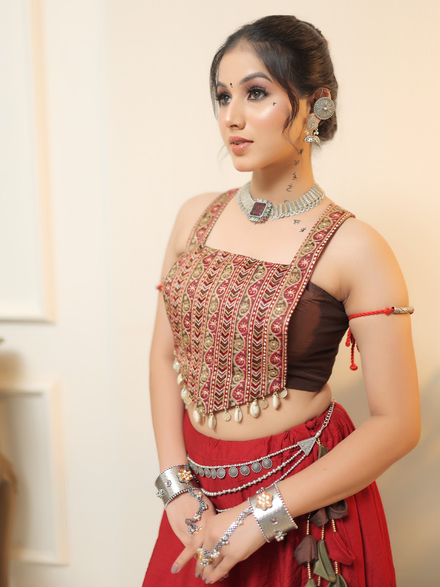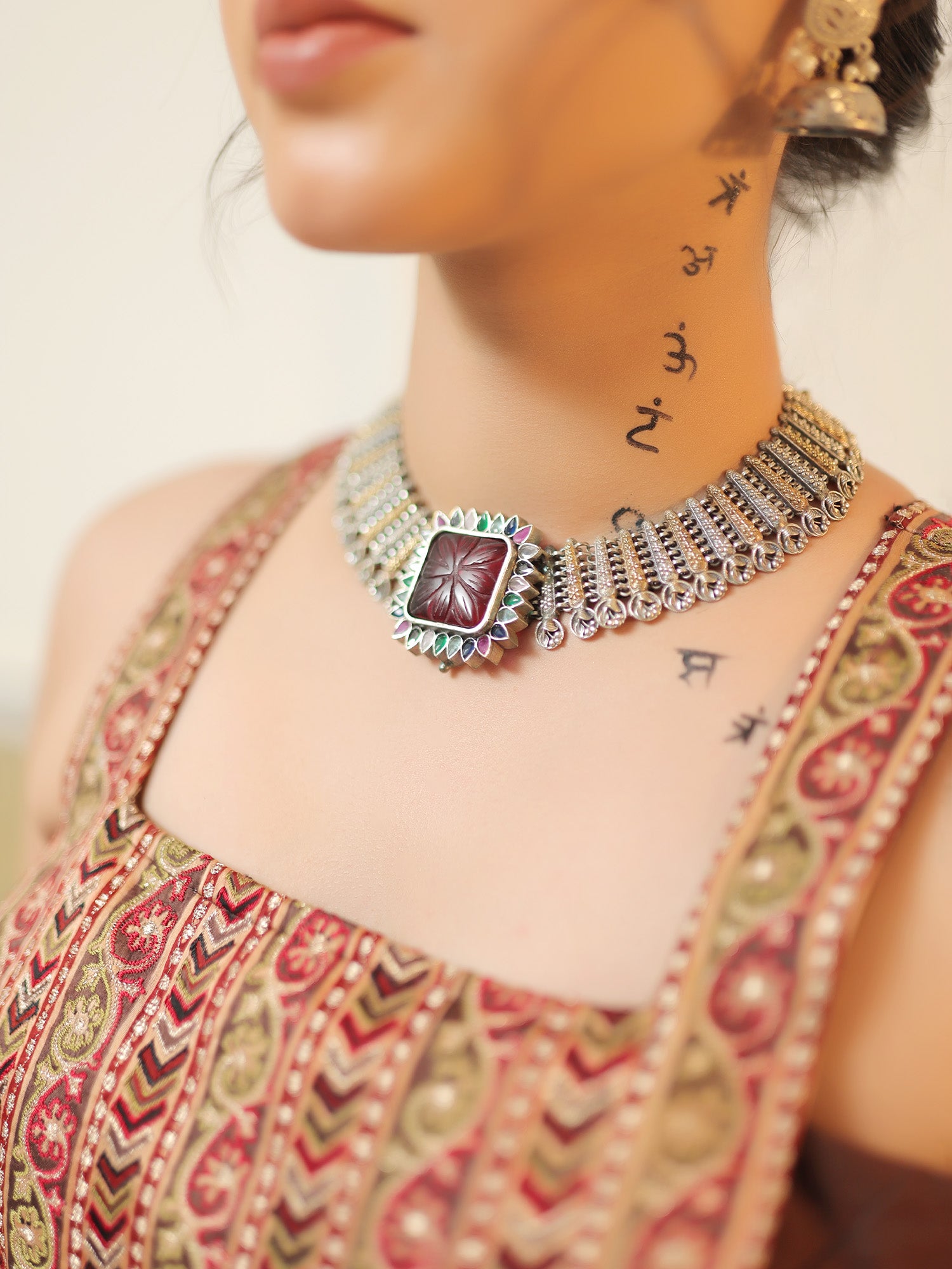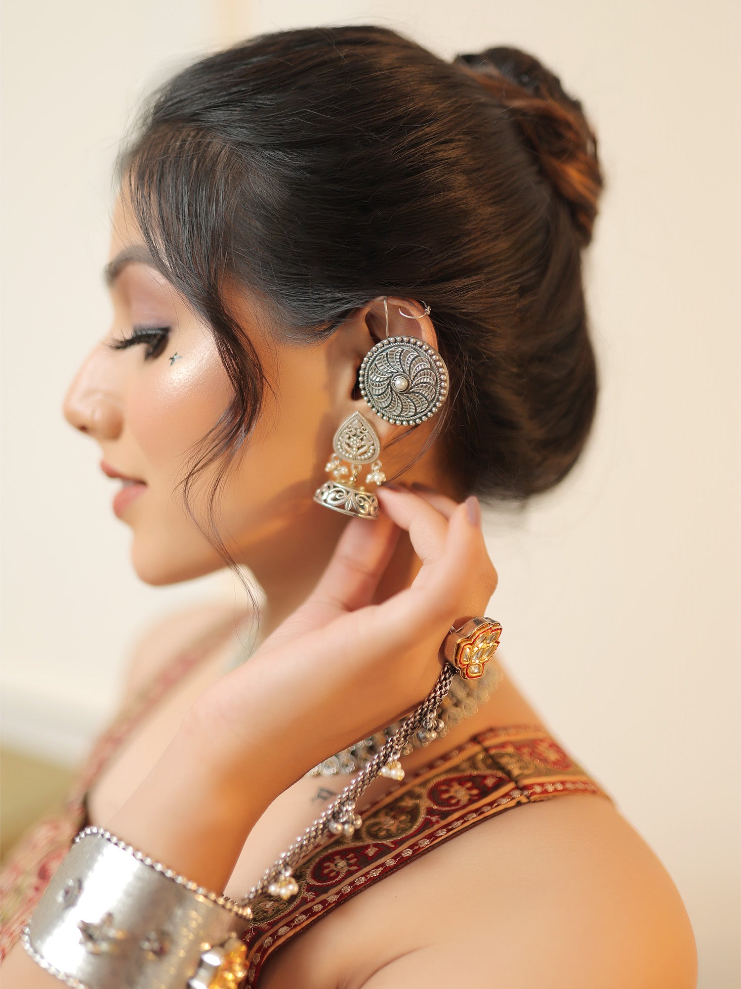Complete your festive look with our elegant Baishaki Jewellery Combo, crafted to add traditional charm and modern flair to your Garba nights. This exquisite oxidised jewellery set features beautifully detailed designs inspired by classic Indian artistry, perfect for elevating any festive ensemble.