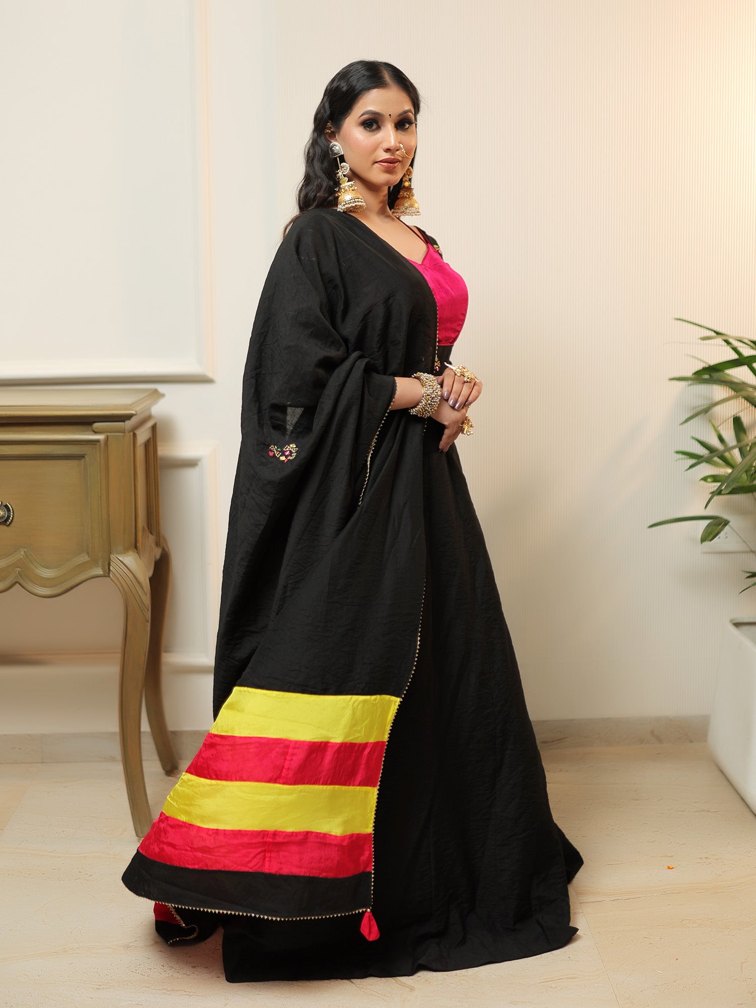 Turn heads this festive season in our vibrant Binal Lehenga, crafted for those who love bold colour and tradition. This stunning ensemble features a striking black base beautifully accented with pops of bright pink and yellow stripes, intricate embroidery, and playful tassels. The hot pink blouse adds a modern twist, making this lehenga a perfect choice for lively Garba nights and festive celebrations.