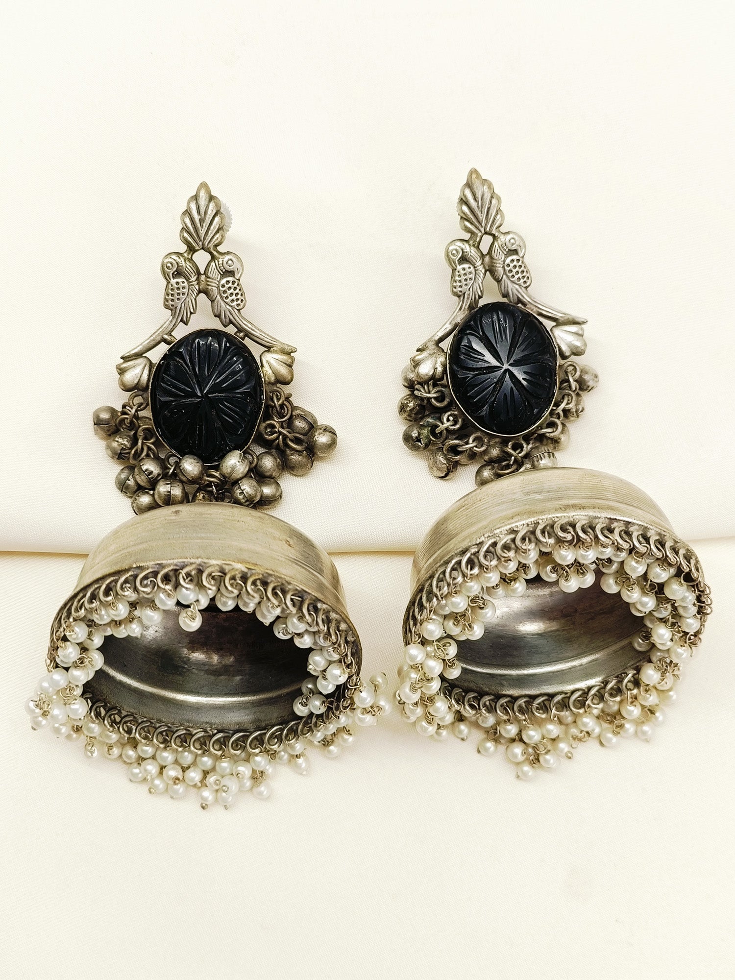 Elevate Your Traditional Collection With This Black Oxidized Jhumki, Crafted From Oxidized Silver-plated Brass For Durability And A Vintage Appeal. Featuring Intricate Carved Stone Detailing, Delicate Pearls, And Authentic Ghunghroo Accents, This Piece Offers A Harmonious Blend Of Texture And Sound. Perfect For Adding A Refined Ethnic Touch To Any Ensemble, It Balances Classic Craftsmanship With Contemporary Style.