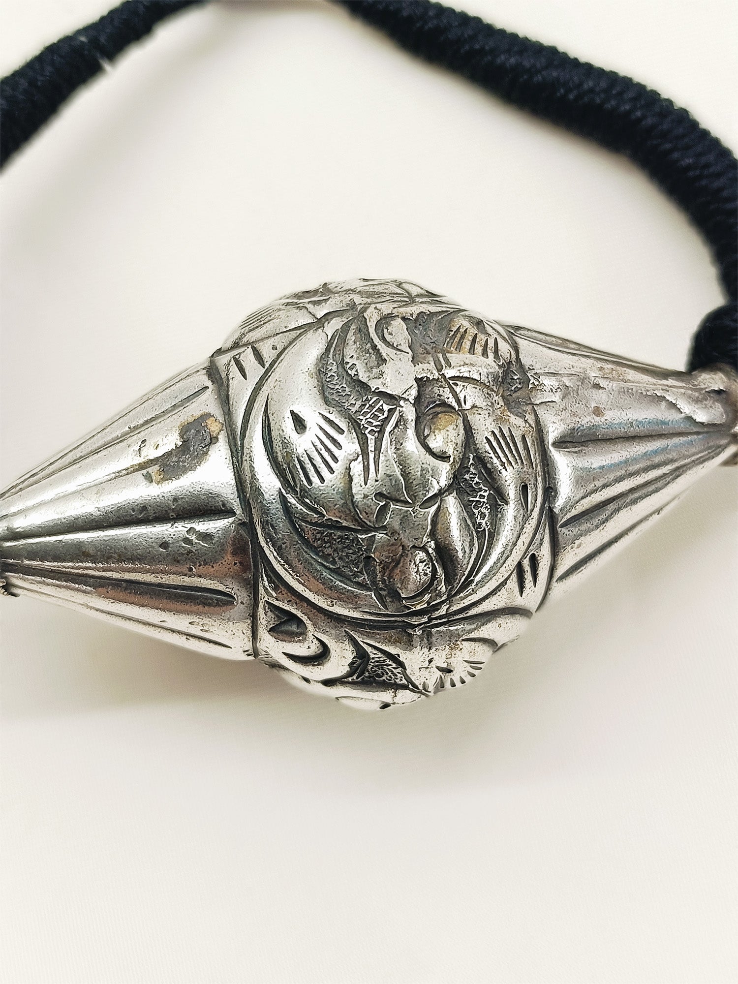 This Black Oxidized Neckpiece Features A Hasli-style Pendant Crafted From Oxidized Silver-plated Brass, Offering A Traditional Yet Durable Design. The Resham Dori Adds A Refined Touch, Ensuring Comfortable Wear And Adjustable Fit. Ideal For Those Seeking An Authentic Ethnic Accessory With Expert Craftsmanship And Lasting Appeal.