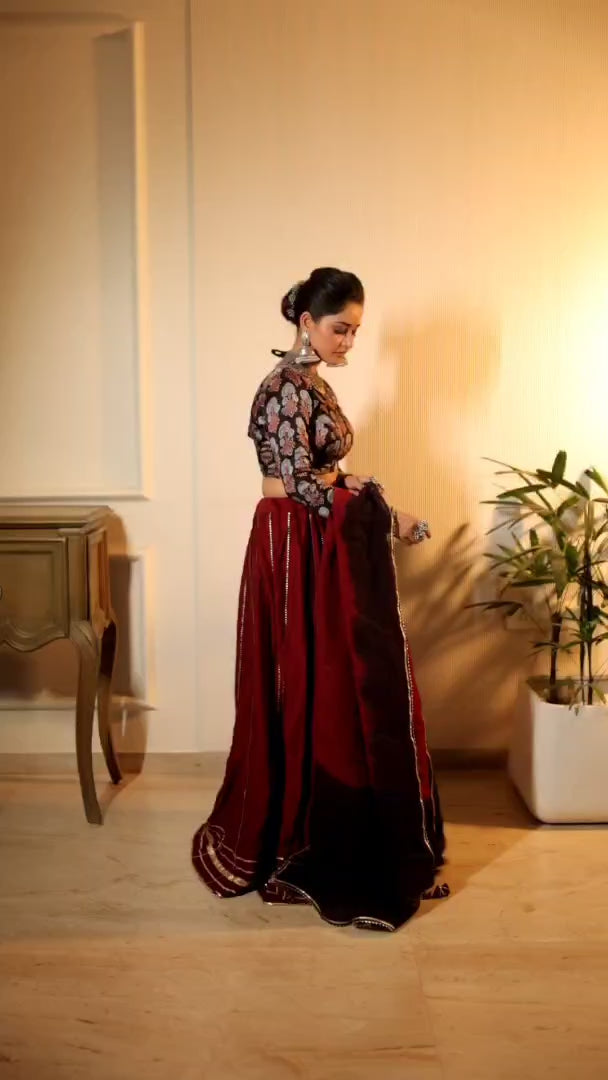 Embrace festive elegance with our stunning Dvija Lehenga, crafted to make every Garba night unforgettable. This lehenga features a striking combination of deep maroon and black tones, paired with a beautifully embroidered blouse showcasing intricate floral patterns. The graceful flare, rich hues, and detailed tassel accents add a touch of royal charm, perfect for vibrant dance celebrations.