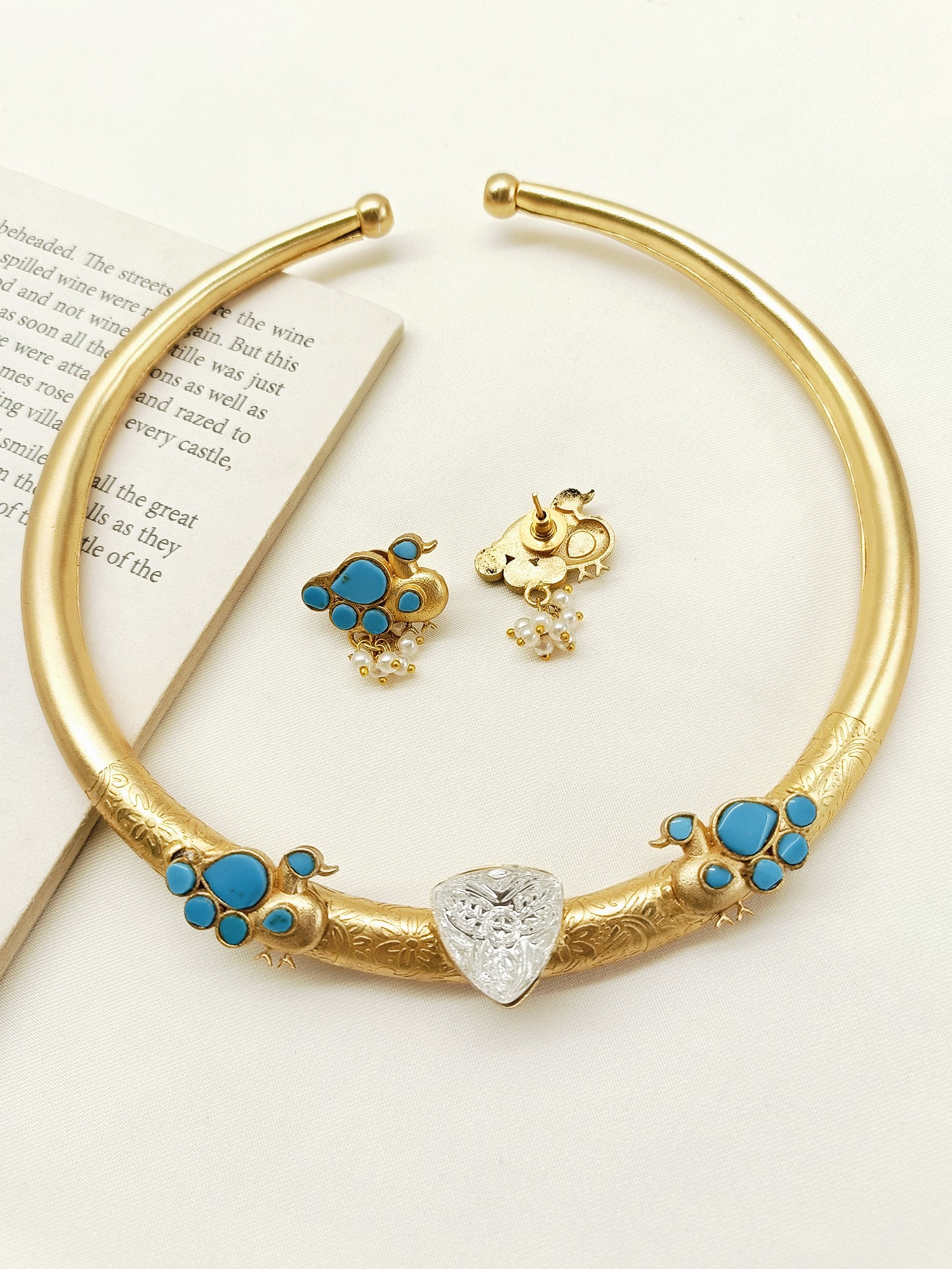 Elevate Your Ensemble With The Firozi Boutique Hasli Styled Choker Set, Expertly Crafted From Brass Metal With A Rich Gold Plating. This Statement Piece Features Carefully Selected Natural Stones That Enhance Its Traditional Allure While Ensuring Durability. Ideal For Adding A Distinguished, Cultural Touch To Both Formal And Festive Attire, This Choker Set Combines Timeless Craftsmanship With Sophisticated Design.