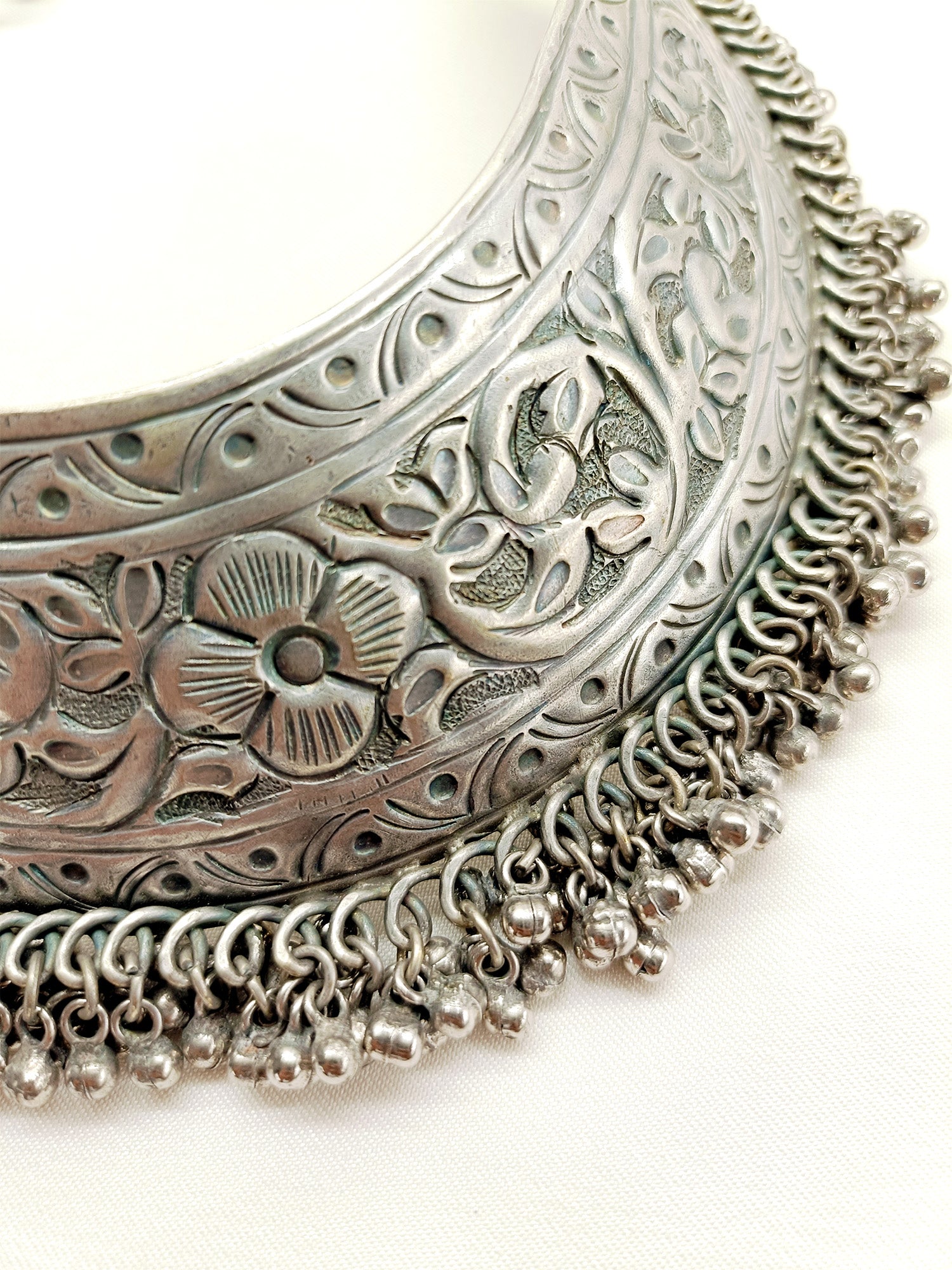 This Stunning German Silver Oxidized Neckpiece Features A Silver Ball Hanging, Crafted From High-quality Oxidized Silver Plated Brass Metal. Flaunt Your Style Wearing This Eye-catching Neckpiece.