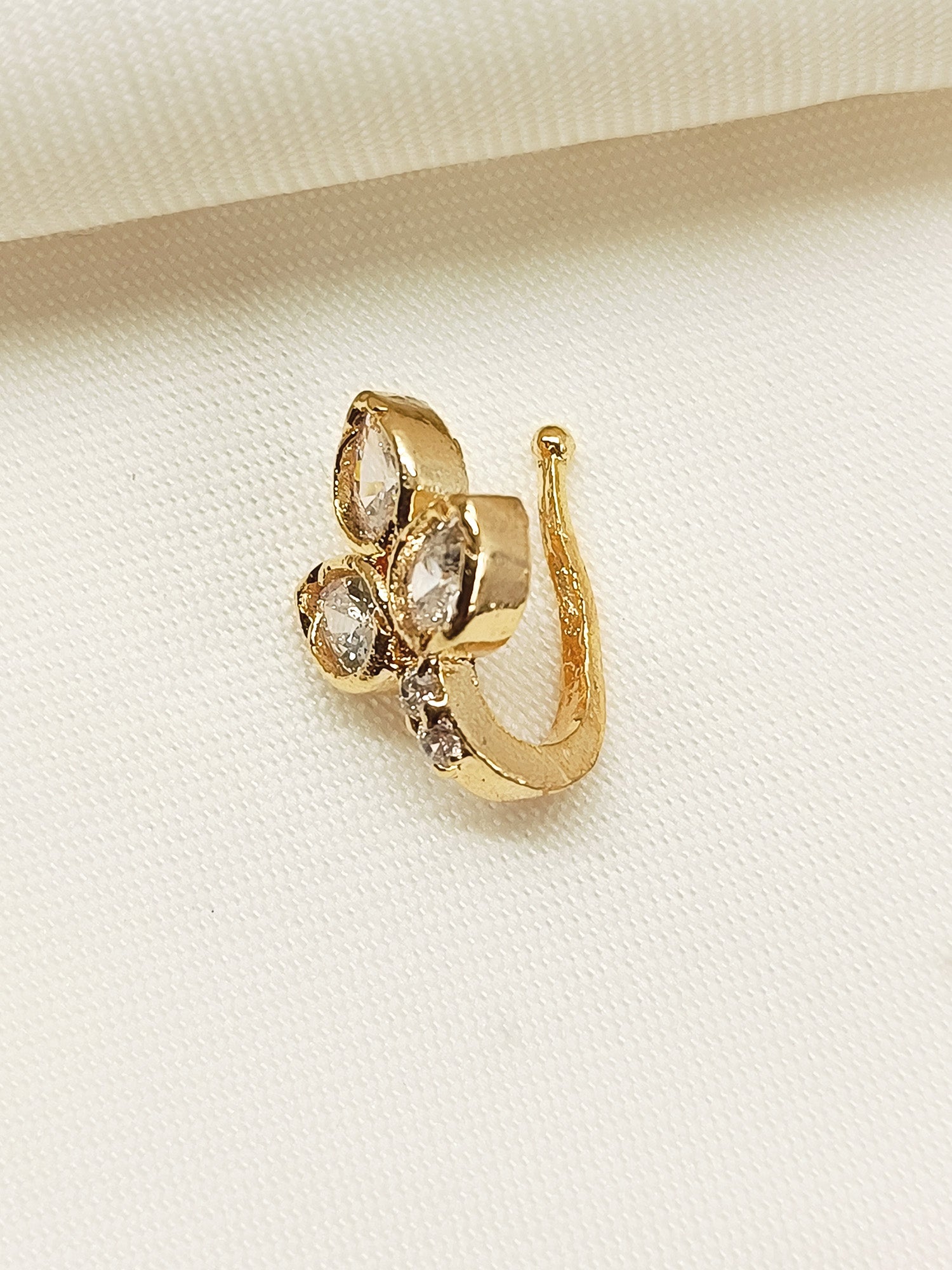 Elevate Your Traditional Look With The Golden American Diamond Pressing Nath. This Gold-plated Accessory Features Sparkling American Diamonds And Is Designed For Non-pierced Noses, Offering A Comfortable And Elegant Alternative To Conventional Nose Rings. Perfect For Special Occasions, It Adds A Refined Touch Without The Need For Piercing.