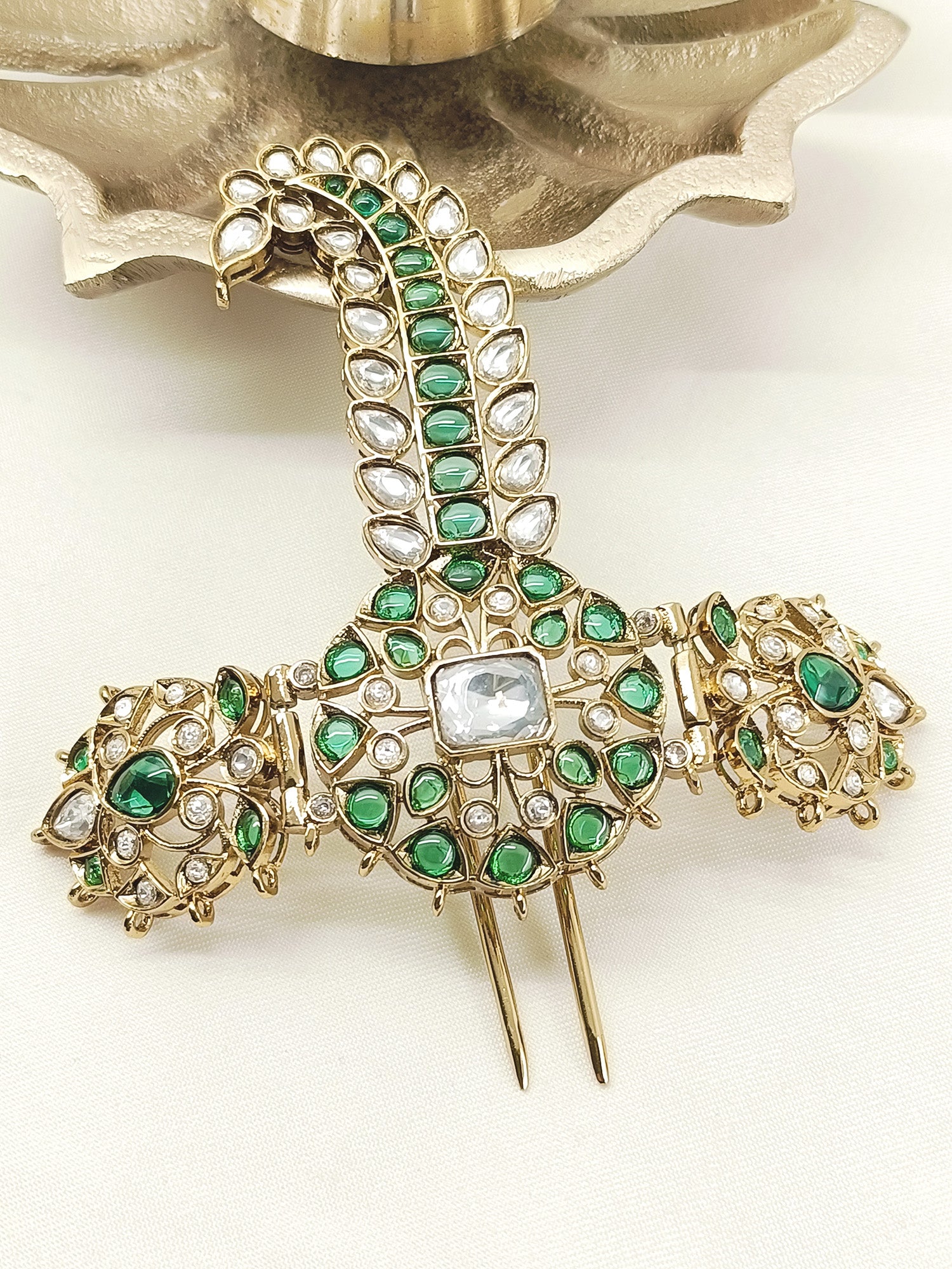 Elevate Your Bridal Ensemble With This Exquisite Green Dulha Kalgi, A Timeless Piece Crafted From Antique Gold-plated Brass. Adorned With Intricate Kundan Work And Vibrant Semi-precious Stones In Verdant Hues, This Traditional Ornament Captures The Opulence Of Heritage Craftsmanship. The Meticulous Detailing And Rich Patina Of The Antique Gold Finish Lend An Authentic, Regal Character Perfect For Wedding Ceremonies. A Distinguished Accessory That Seamlessly Blends Classical Artistry With Contemporary Elegance, Ensuring You Command Attention On Your Special Day.