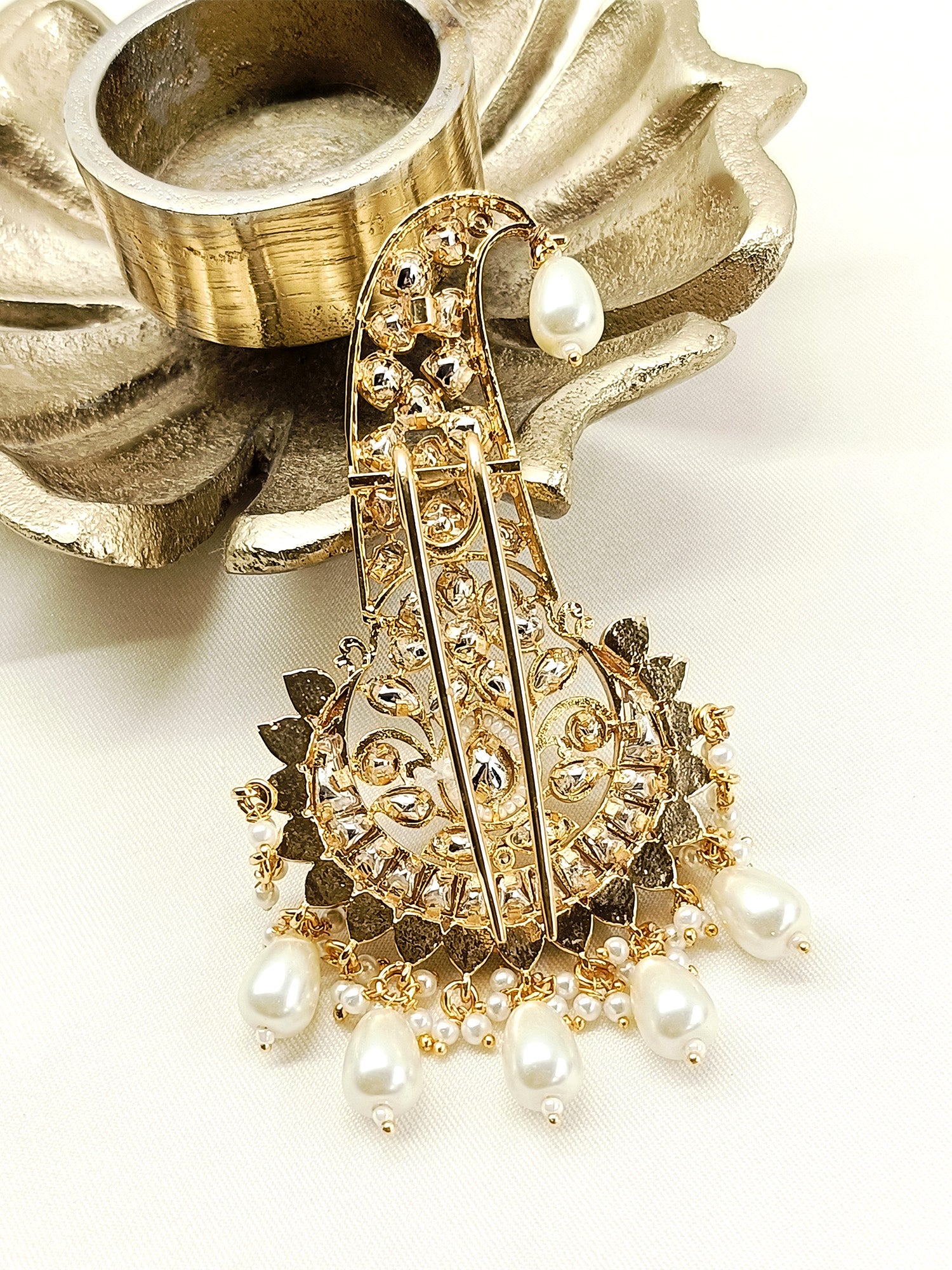 This Traditional Dulha Kalgi Is Crafted From Gold-plated Brass, Featuring Elegant Pearls That Delicately Hang To Enhance Its Regal Appeal. Adorned With Semi-precious Stones, It Adds A Refined Touch To The Groom’s Attire, Blending Classic Design With Subtle Sophistication. Ideal For Weddings, This Accessory Complements Traditional Outfits With Its Rich Detailing And Timeless Charm.