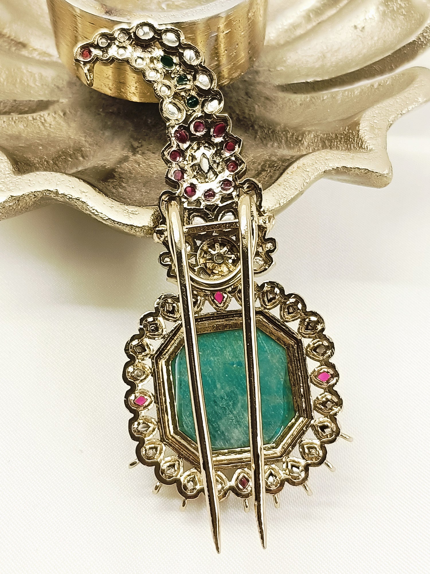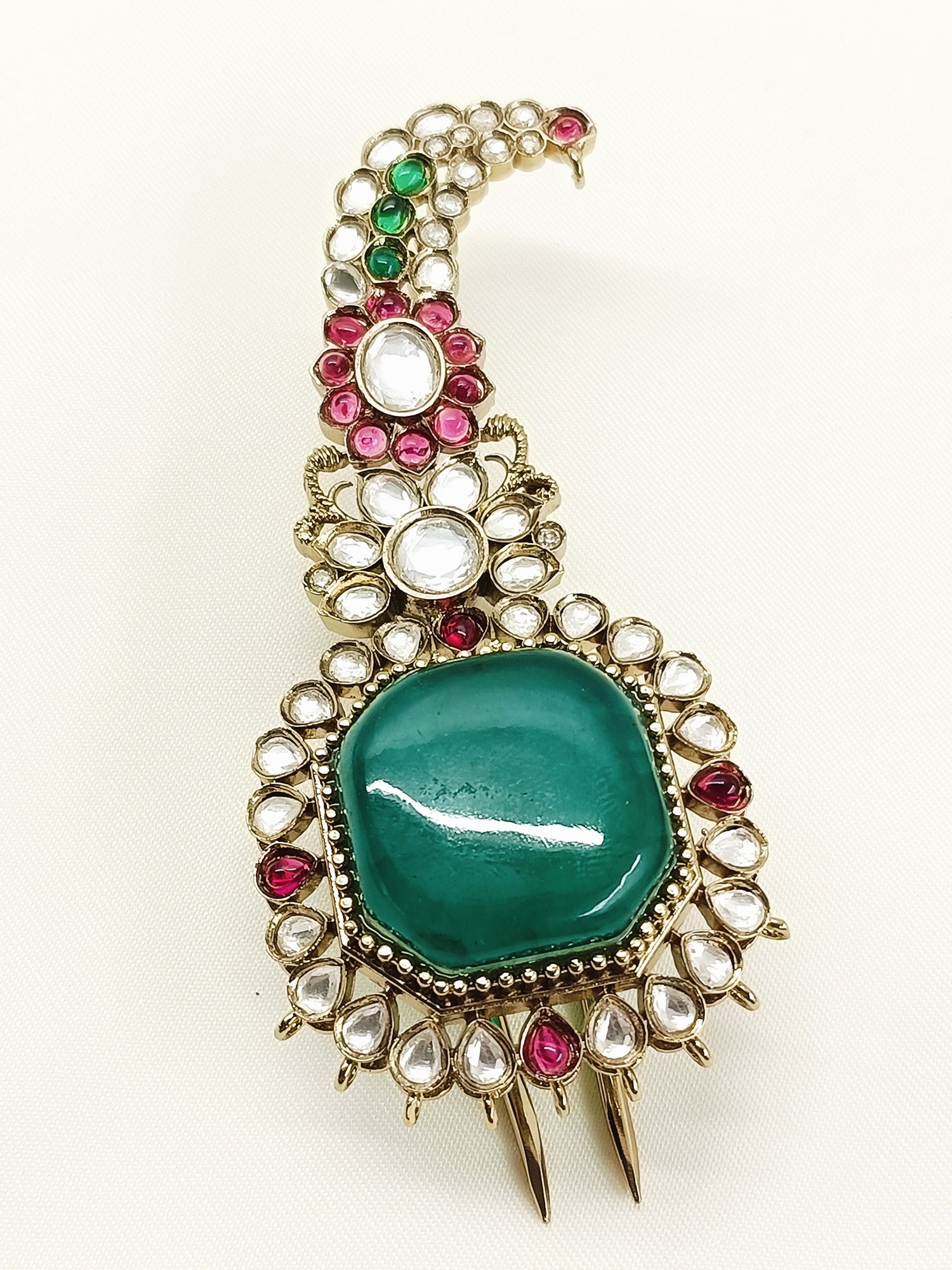 This Prashant Green Dulha Kalgi Features Intricate Antique Gold Plating On Durable Brass Metal, Adorned With Semi-precious Stones Including Vibrant Green Morganite And Sparkling American Diamonds. Designed For Distinguished Occasions, It Combines Traditional Craftsmanship With Elegant Detailing, Making It An Expert Choice For A Groom’s Ceremonial Attire.