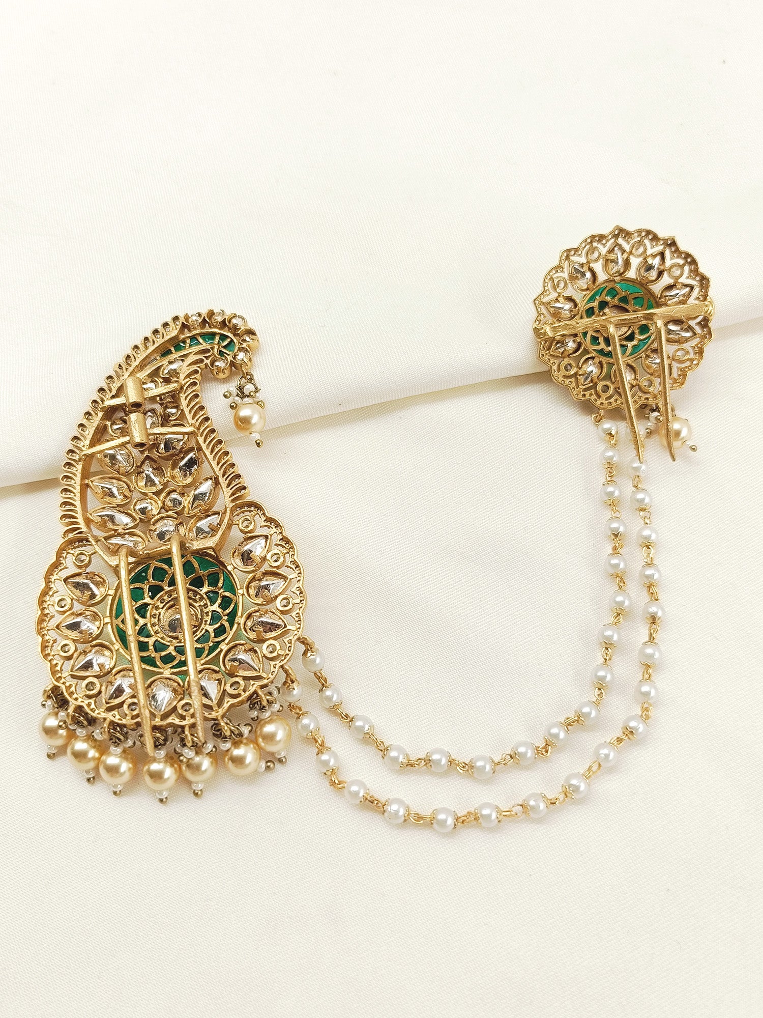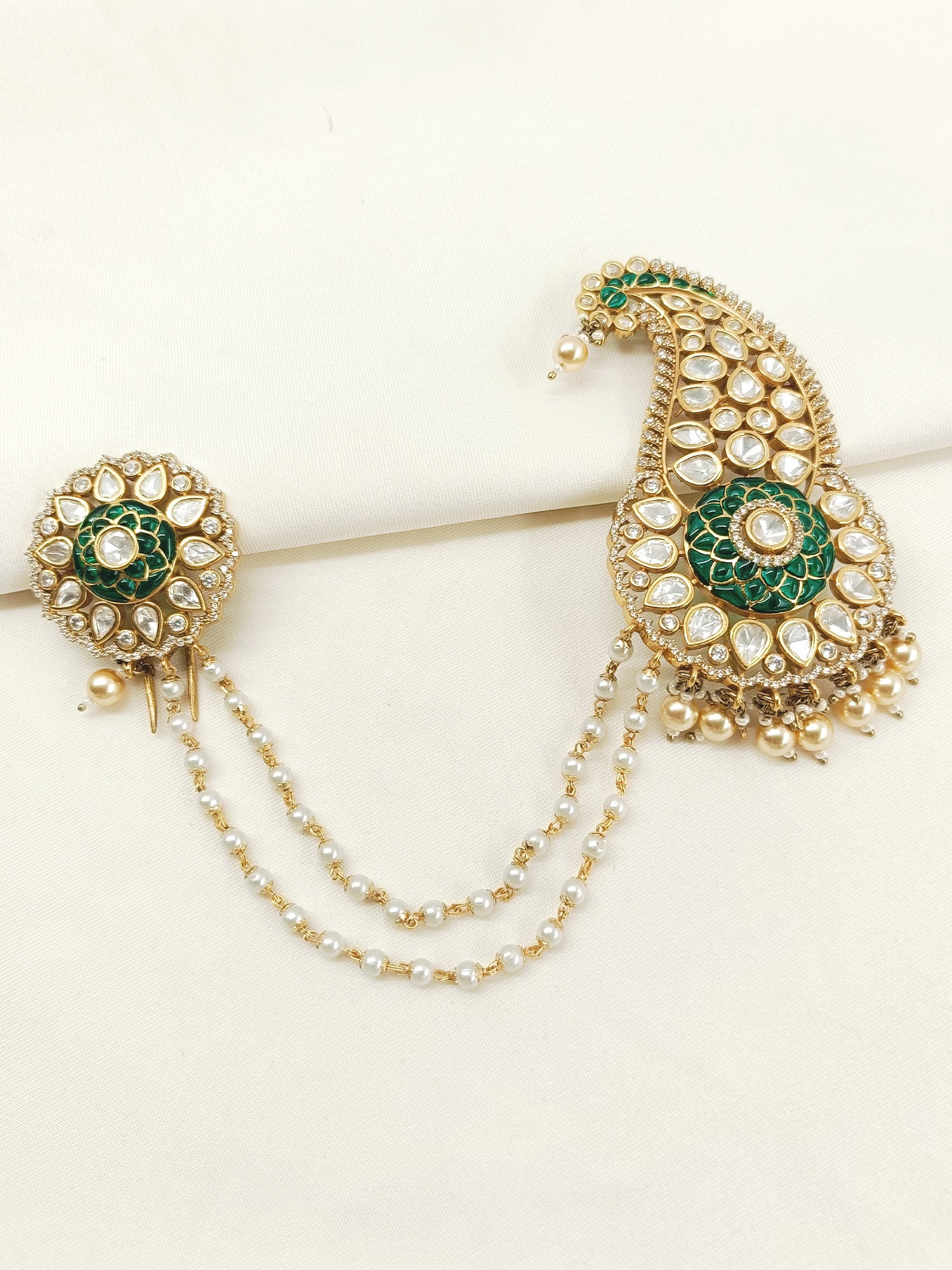 Add A Touch Of Regal Elegance To Your Indian Wedding Ensemble With The Green Dulha Kalgi. Beautifully Adorned With Kundan And Semi Precious Stones, The Antique Gold Plating On Brass Metal Exudes Luxury. The Pearl Attachment Adds A Classic Touch, Making It The Perfect Addition To Your Sherwani Or Pagdi.