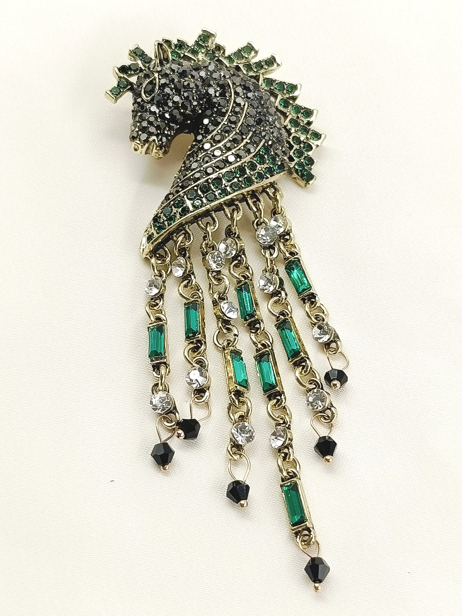 This Striking Men's Brooch Features An Intricately Crafted Green Horse Design, Expertly Rendered In Antique Gold-plated Brass For A Sophisticated, Timeless Appeal. Adorned With Shimmering Rhino Stones That Catch The Light Beautifully, The Piece Showcases Elegant Hanging Details That Add Movement And Dimension. Perfect For Elevating Formal Wear Or Making A Bold Statement On Everyday Attire, This Brooch Combines Traditional Craftsmanship With Distinctive Style. The Durable Brass Construction Ensures Lasting Wear, While The Antique Gold Finish Provides A Refined, Vintage-inspired Aesthetic That Complements Any Wardrobe.