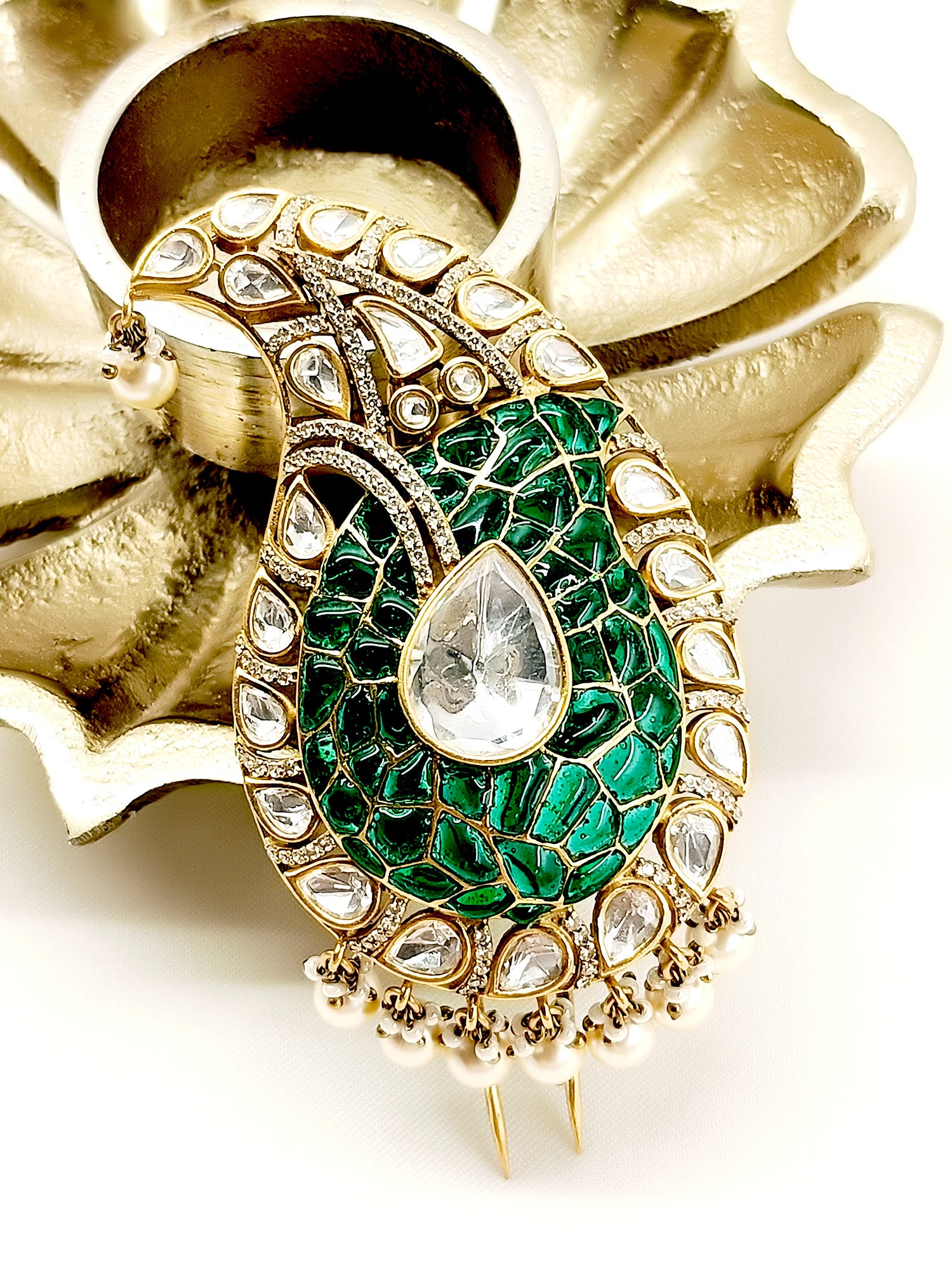 Enhance Your Wedding Attire With Our Kundan Dulha Kalgi. Made With Gold Plated Brass Metal And Exquisite Kundan Work, It Features A Stunning American Diamond Setting And Elegant Pearl Hanging. Elevate Your Look With This Traditional And Timeless Accessory.