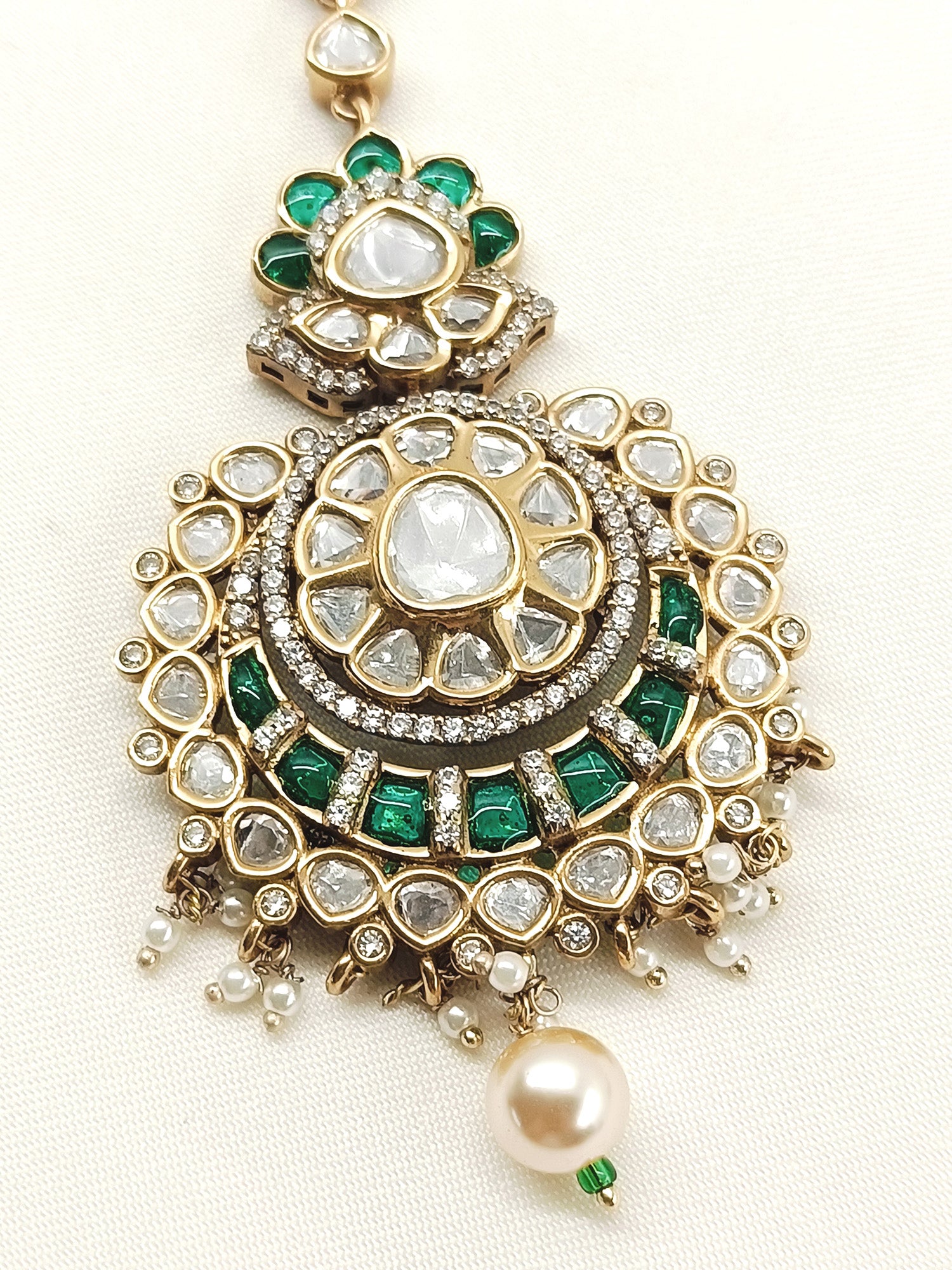 Elevate Your Bridal Ensemble With This Exquisite Green Kundan Teeka, A Timeless Piece That Seamlessly Blends Traditional Craftsmanship With Contemporary Elegance. Meticulously Crafted From Antique Gold-plated Brass, This Teeka Features Authentic Kundan Work Adorned With Vibrant Semi-precious Stones And Sparkling American Diamonds. The Intricate Detailing Showcases The Artisan's Expertise, While The Rich Green Hues Complement A Variety Of Skin Tones And Outfits. Perfect For Weddings, Festivals, And Special Occasions, This Versatile Accessory Adds A Touch Of Regal Sophistication To Your Jewelry Collection. A Statement Piece That Honors Heritage While Celebrating Modern Style.