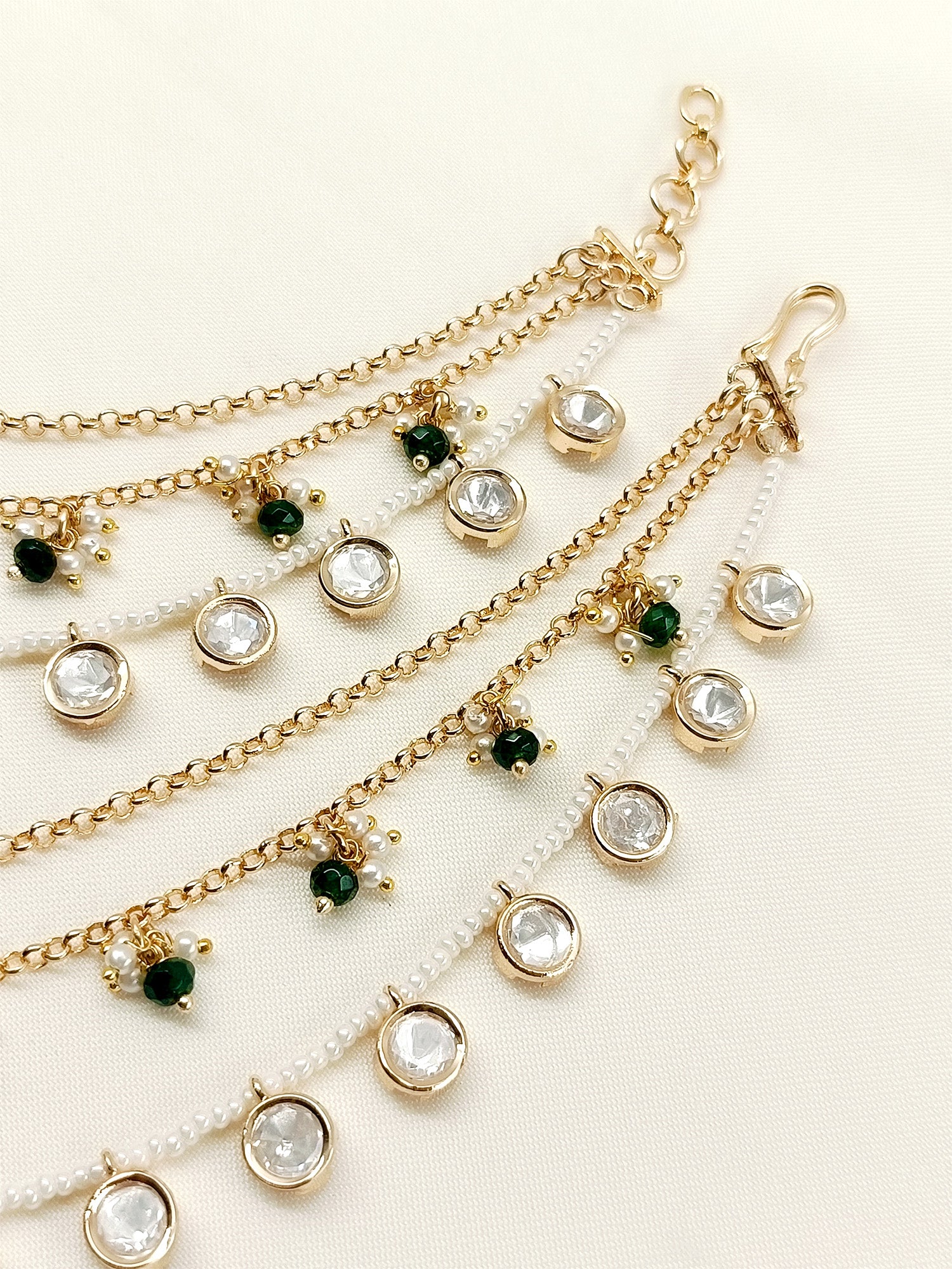 Elevate Your Traditional Look With The Traditional Ear Chain, Featuring A Gold-plated Finish And Triple-layered Kundan Pearls. This Exquisite Piece Combines Classic Craftsmanship With Elegant Design, Offering A Refined Accessory That Enhances Any Ethnic Ensemble With Subtle Sophistication. Perfect For Special Occasions, It Adds A Touch Of Timeless Charm To Your Jewelry Collection.