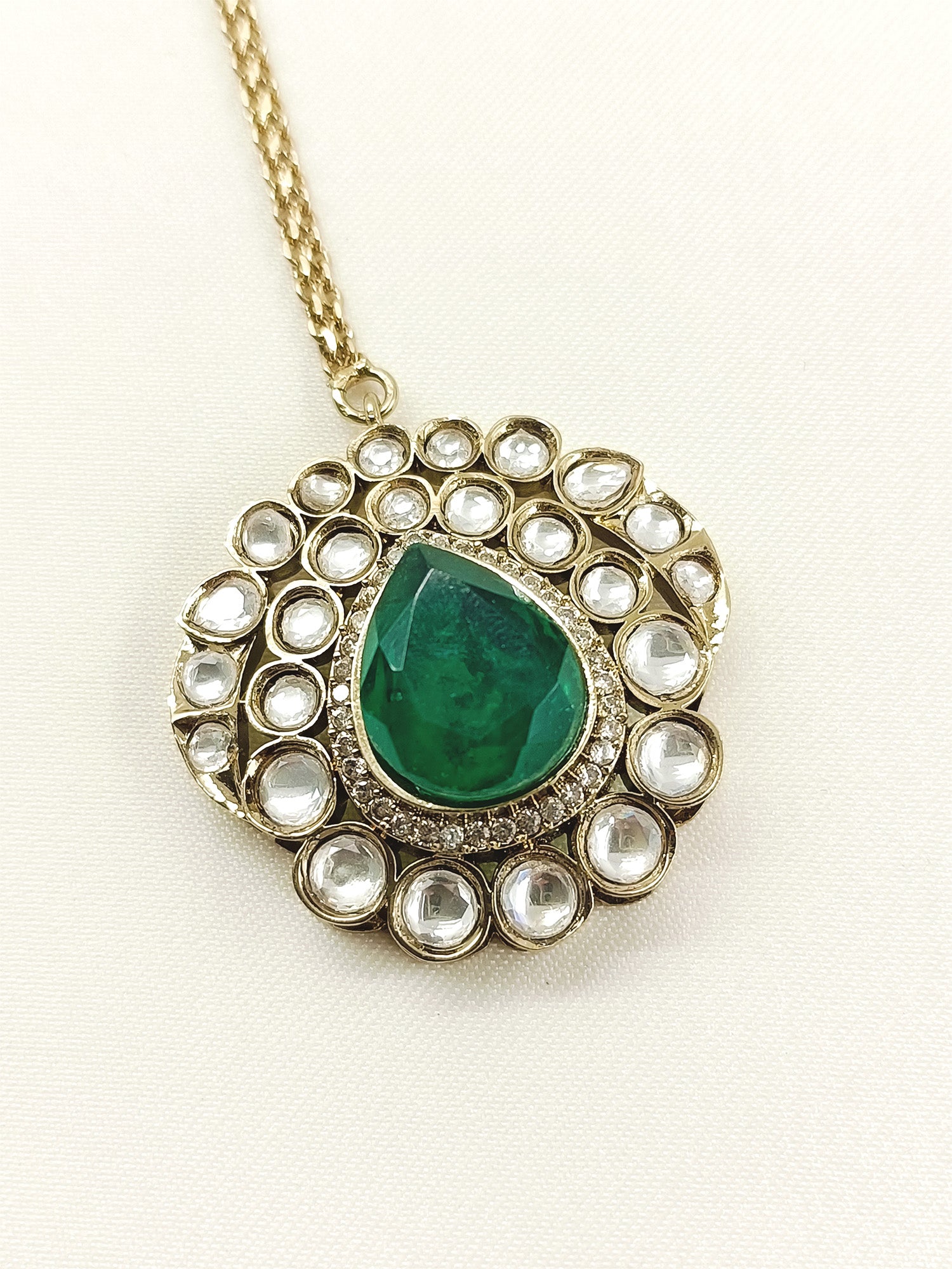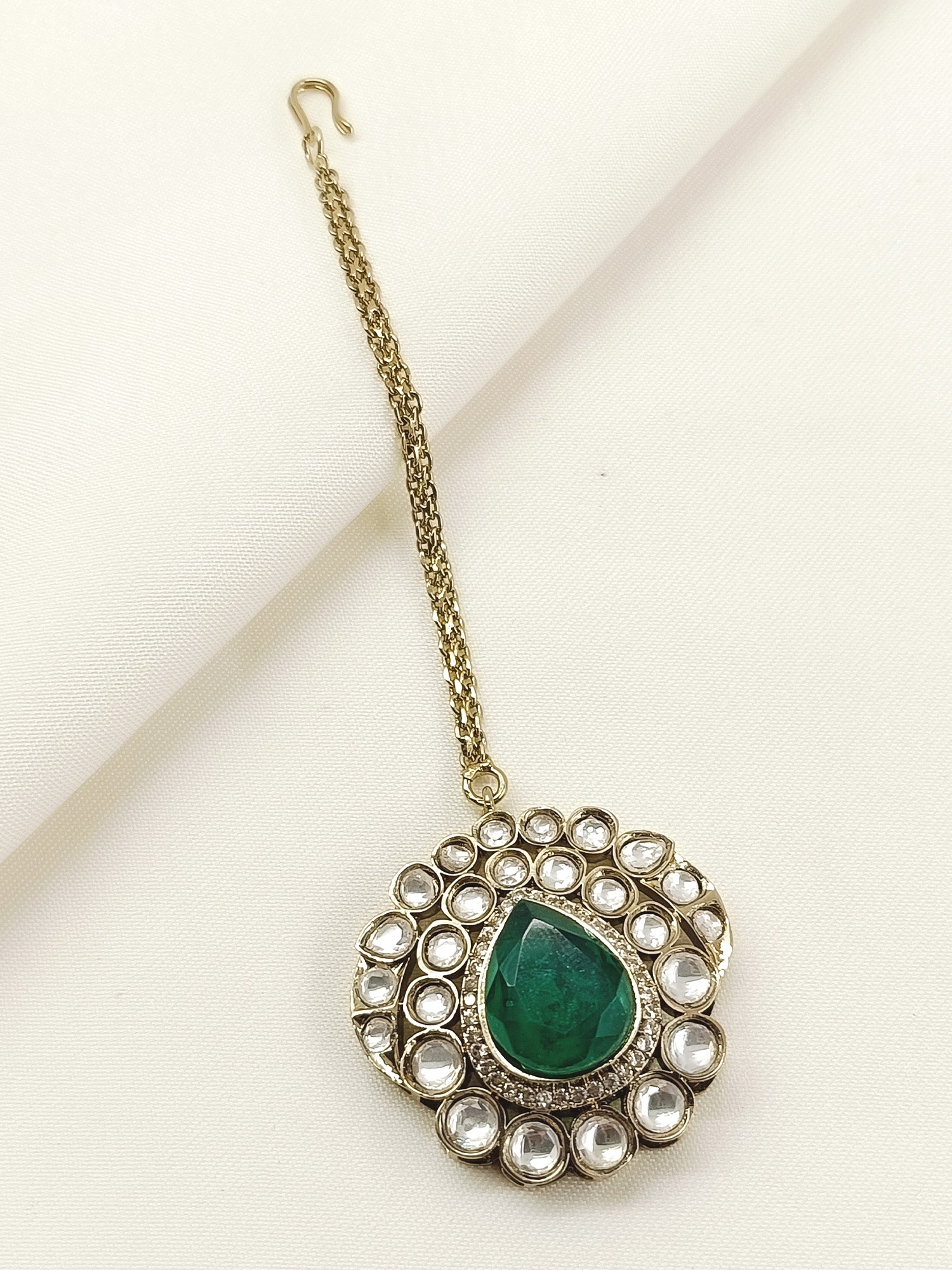 This Green Victorian Bridal Set Features Antique Gold-plated Brass Metalwork, Enhanced With Exquisite American Diamonds And Semi-precious Stones. Highlighted By An Elegant Emerald Doublet Stone, This Set Combines Vintage Charm With Refined Craftsmanship, Making It An Ideal Choice For Bridal Occasions Seeking Timeless Sophistication.