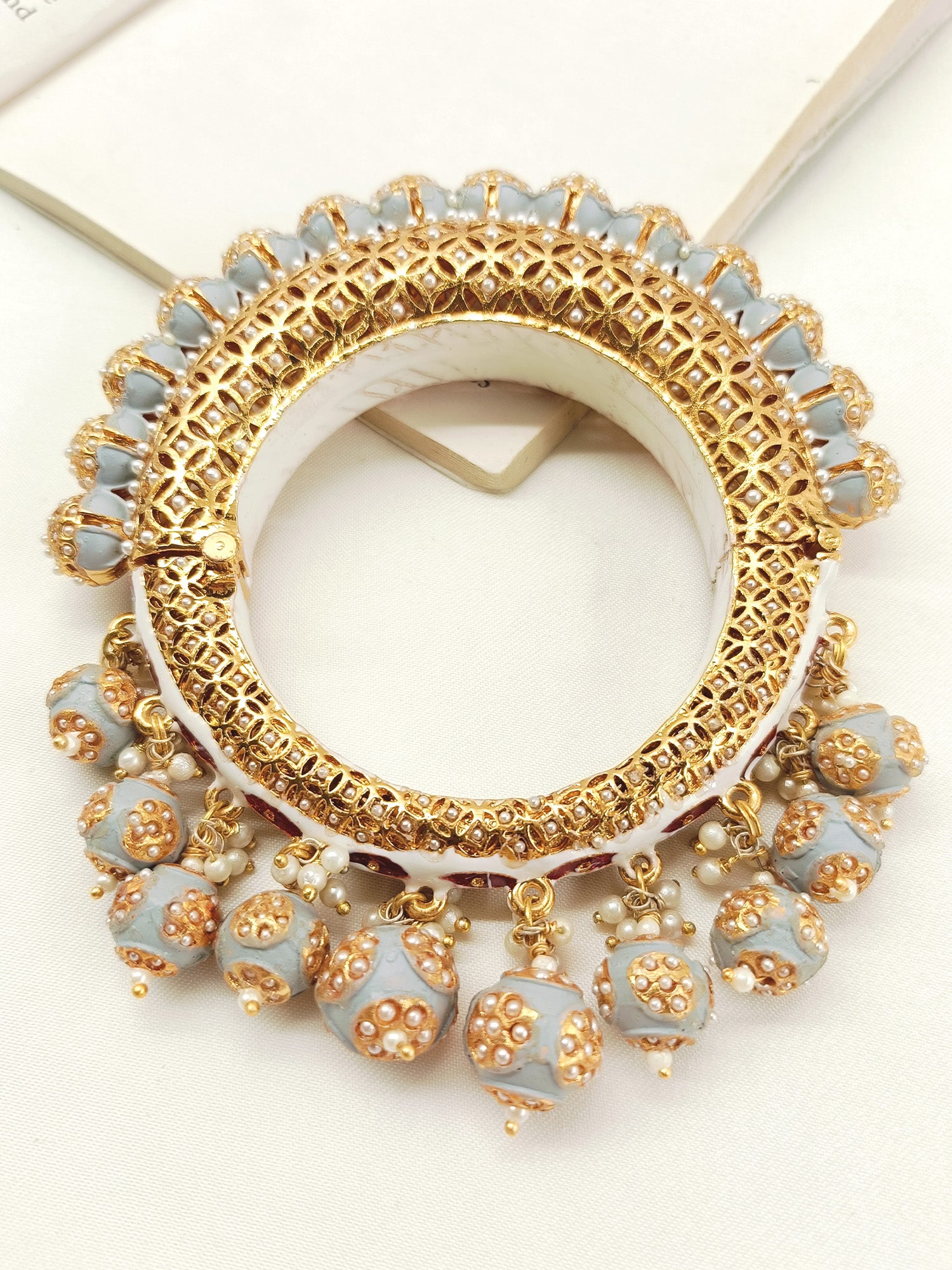 Crafted From Brass With Antique Gold Plating, This Exquisite Kada Showcases Traditional Meenakari Artistry Enhanced With Lustrous Pearls And A Refined Antique Polish. The Grey Hue, Combined With Intricate Enamel Work, Creates A Sophisticated Piece That Bridges Heritage Craftsmanship With Contemporary Elegance. Perfect For Special Occasions Or As A Treasured Addition To Your Jewelry Collection, This Kada Exemplifies Timeless Artisanal Excellence.