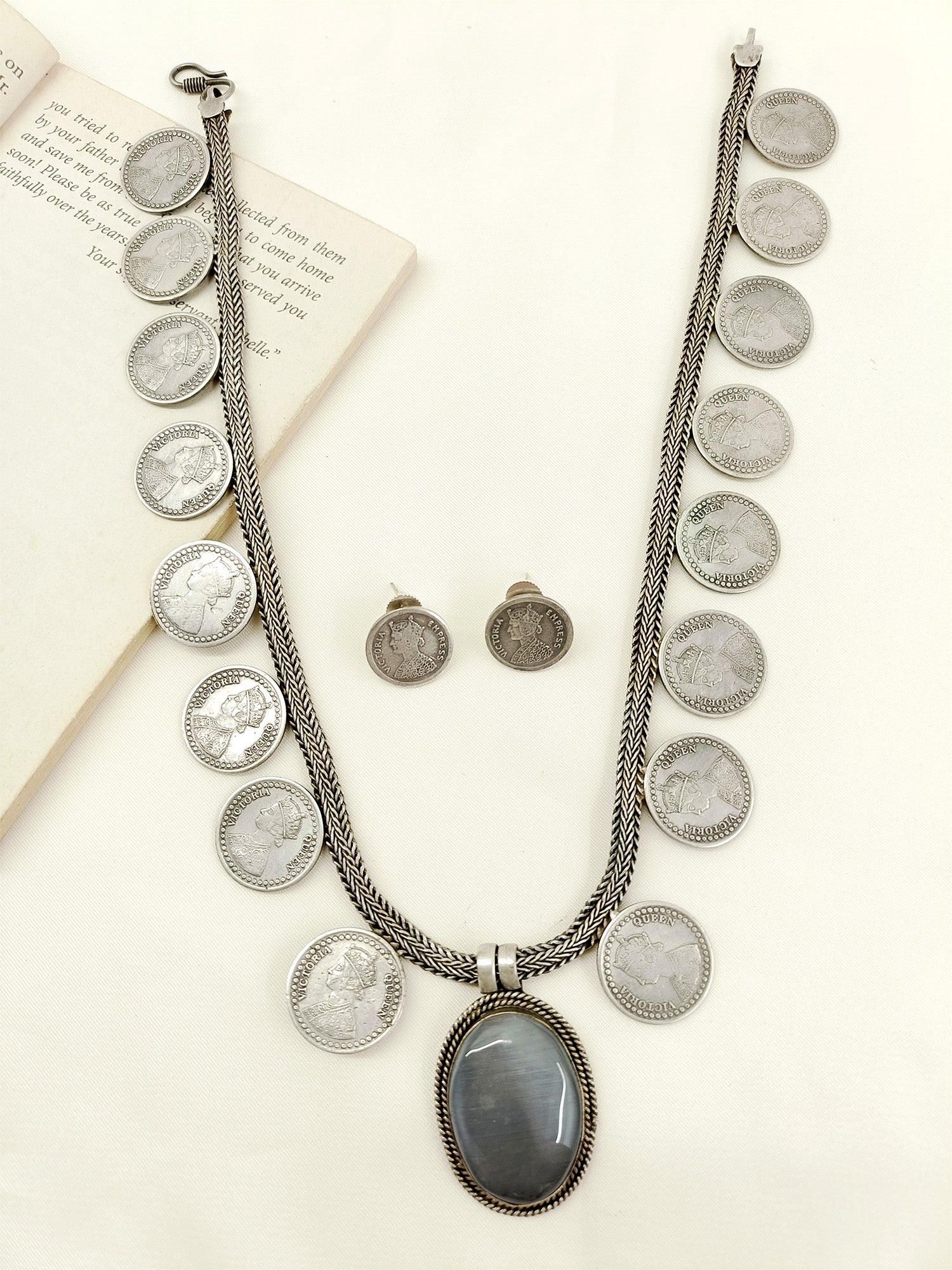 Discover The Stunning Beauty Of This German Silver Oxidized Necklace Set. Made With High-quality Silver Plated Brass Metal, It Exudes Elegance And Sophistication. Elevate Your Style With This One-of-a-kind Piece And Make A Statement Wherever You Go.