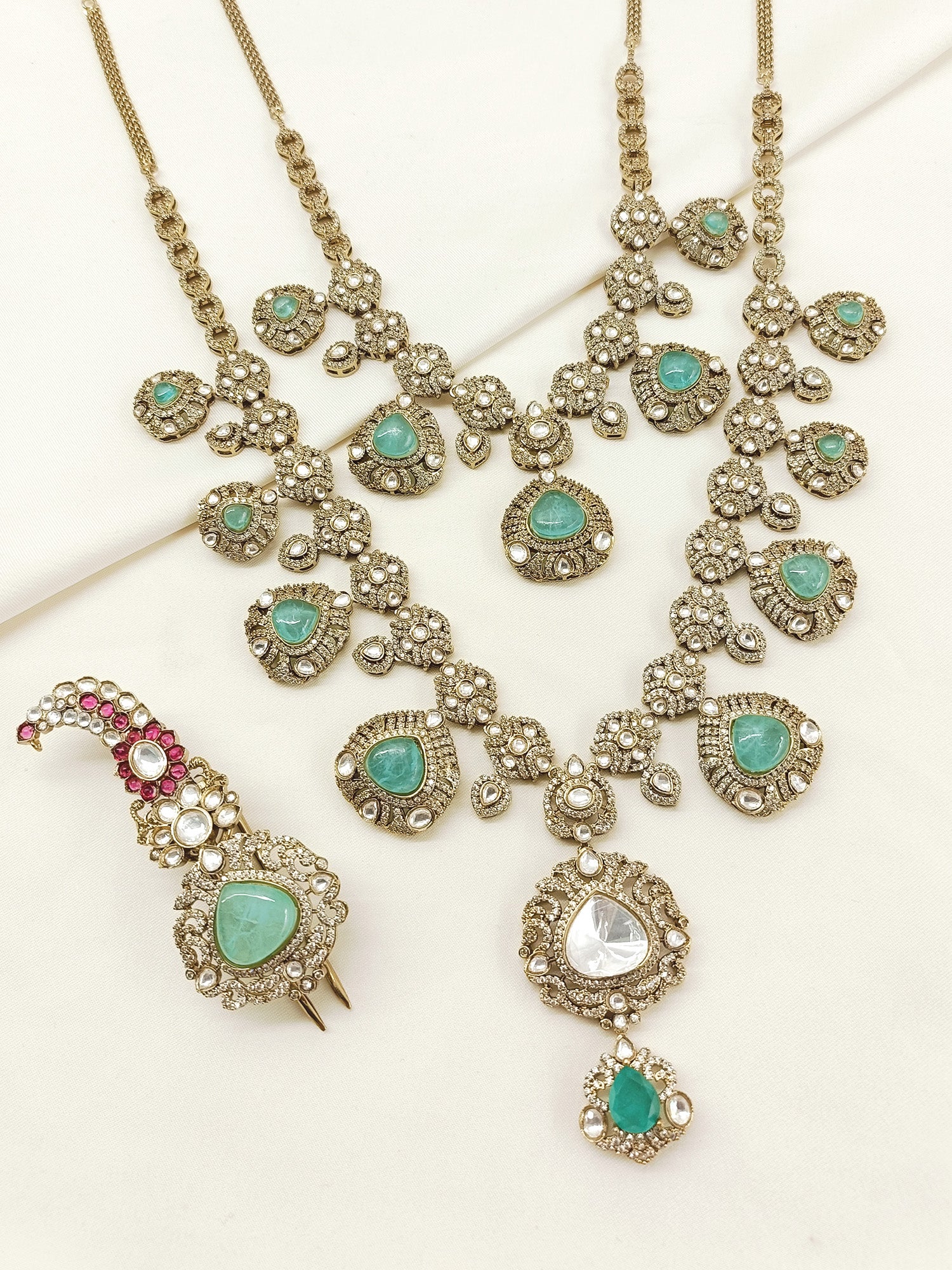 Elevate Your Groom's Wedding Ensemble With This Exquisite Mala And Kalgi Set In Captivating Mint Green. Crafted With Antique Gold Plating On Premium Brass Metal, This Piece Combines Timeless Elegance With Contemporary Sophistication. Adorned With Brilliant American Diamonds, Lustrous Moissanite, And Striking Doublet Stones, Each Element Catches Light Beautifully For Maximum Radiance. The Intricate Design Showcases Masterful Craftsmanship, Making It An Ideal Choice For Grooms Seeking Refined Luxury. Perfect For Weddings, Engagements, And Special Celebrations, This Set Delivers Both Aesthetic Appeal And Lasting Quality. A Statement Piece That Transforms Traditional Bridal Wear Into Something Truly Memorable.