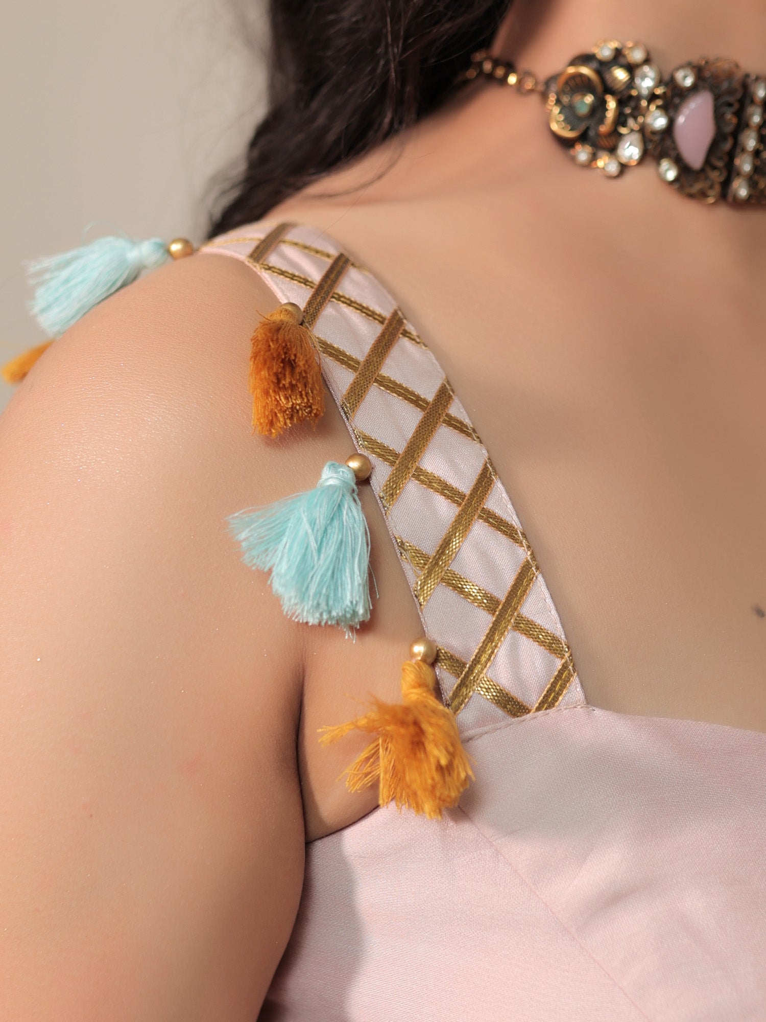 Radiate Grace This Festive Season In Our Elegant Insiyah Lehenga With Jewellery, A Soft Symphony Of Pastel Pink And Mint Accents. Designed With A Minimal Yet Chic Blouse, Flowing Skirt, And Contrasting Dupatta, This Ensemble Exudes Feminine Charm. Embellished Tassels, Ornate Choker Necklace, And Intricate Hand Accessories Complete The Look, Making It Perfect For Weddings, Festivities, And Special Occasions.