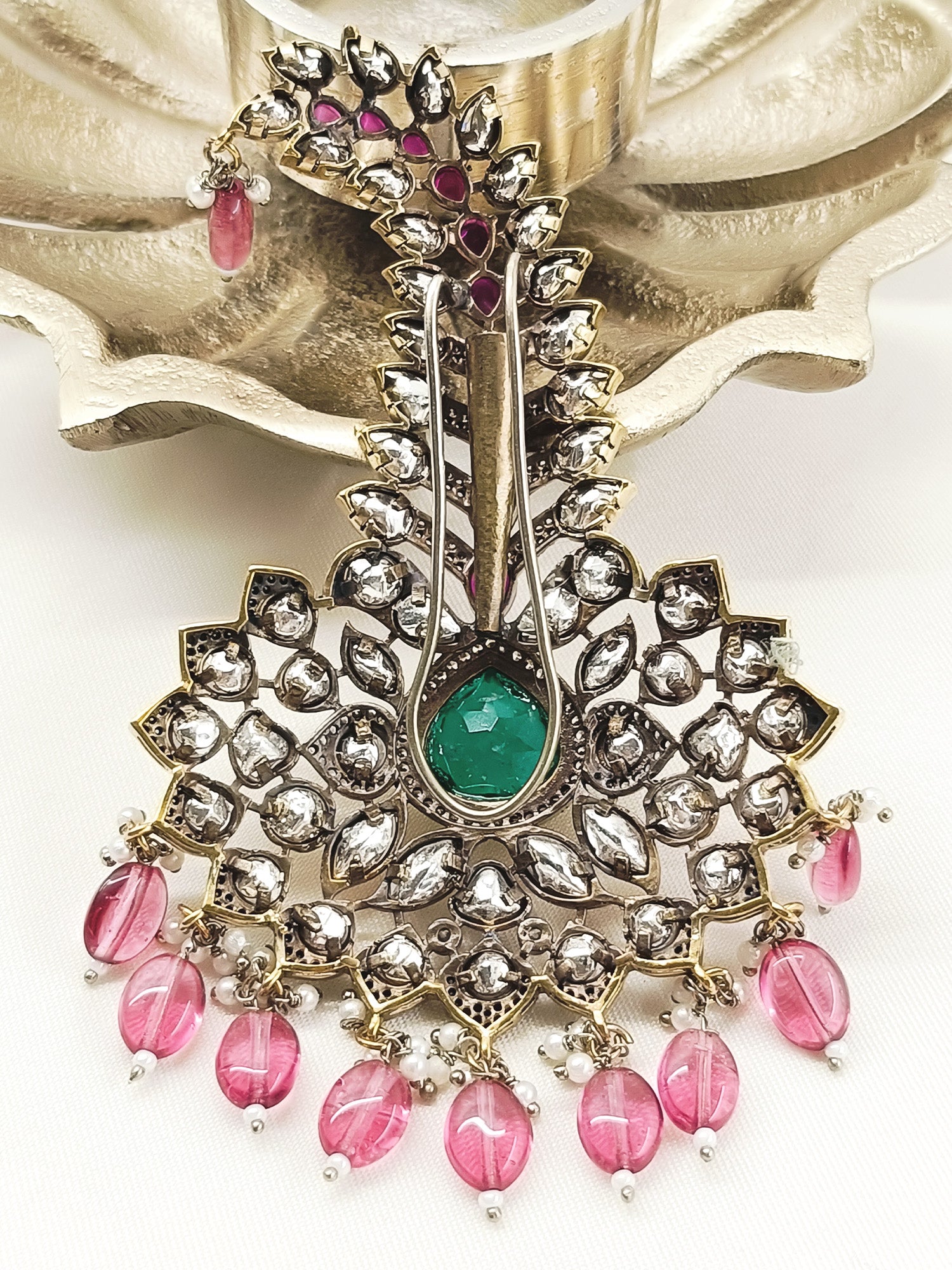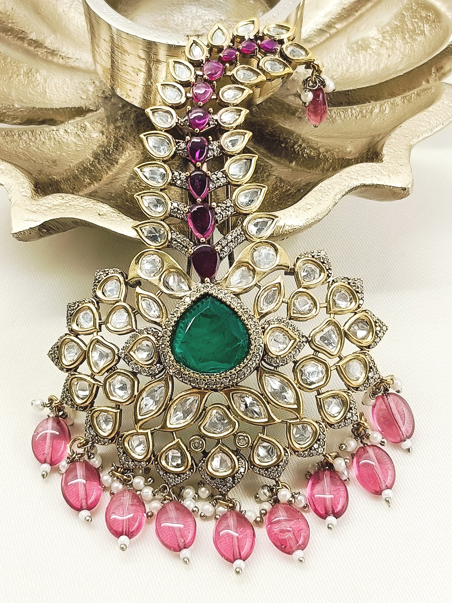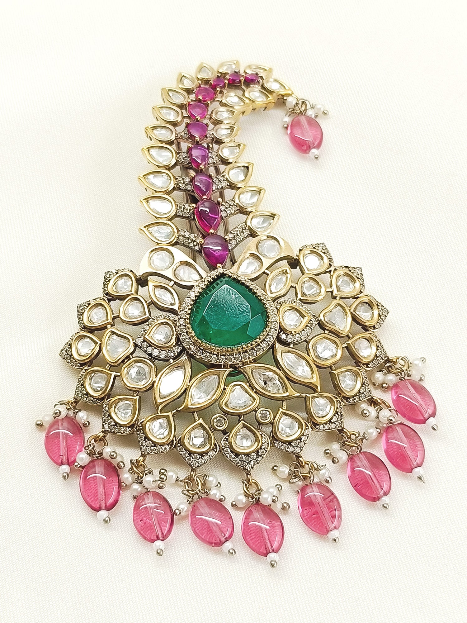 Elevate Your Bridal Ensemble With This Exquisite Dulha Kalgi, Meticulously Crafted For The Groom's Special Day. This Ornamental Headpiece Features Antique Gold Plating On Premium Brass, Adorned With Lustrous Kundan Work That Catches Light Beautifully. The Design Incorporates American Diamonds And Moissanite For Brilliant Sparkle, Complemented By Semi-precious Stones That Add Depth And Richness. Delicate Pearl And Bead Hangings Create Graceful Movement, Enhancing The Piece's Traditional Elegance. Perfect For Weddings And Celebrations, This Kalgi Combines Timeless Craftsmanship With Refined Aesthetics, Ensuring You Stand Out With Sophisticated Style.
