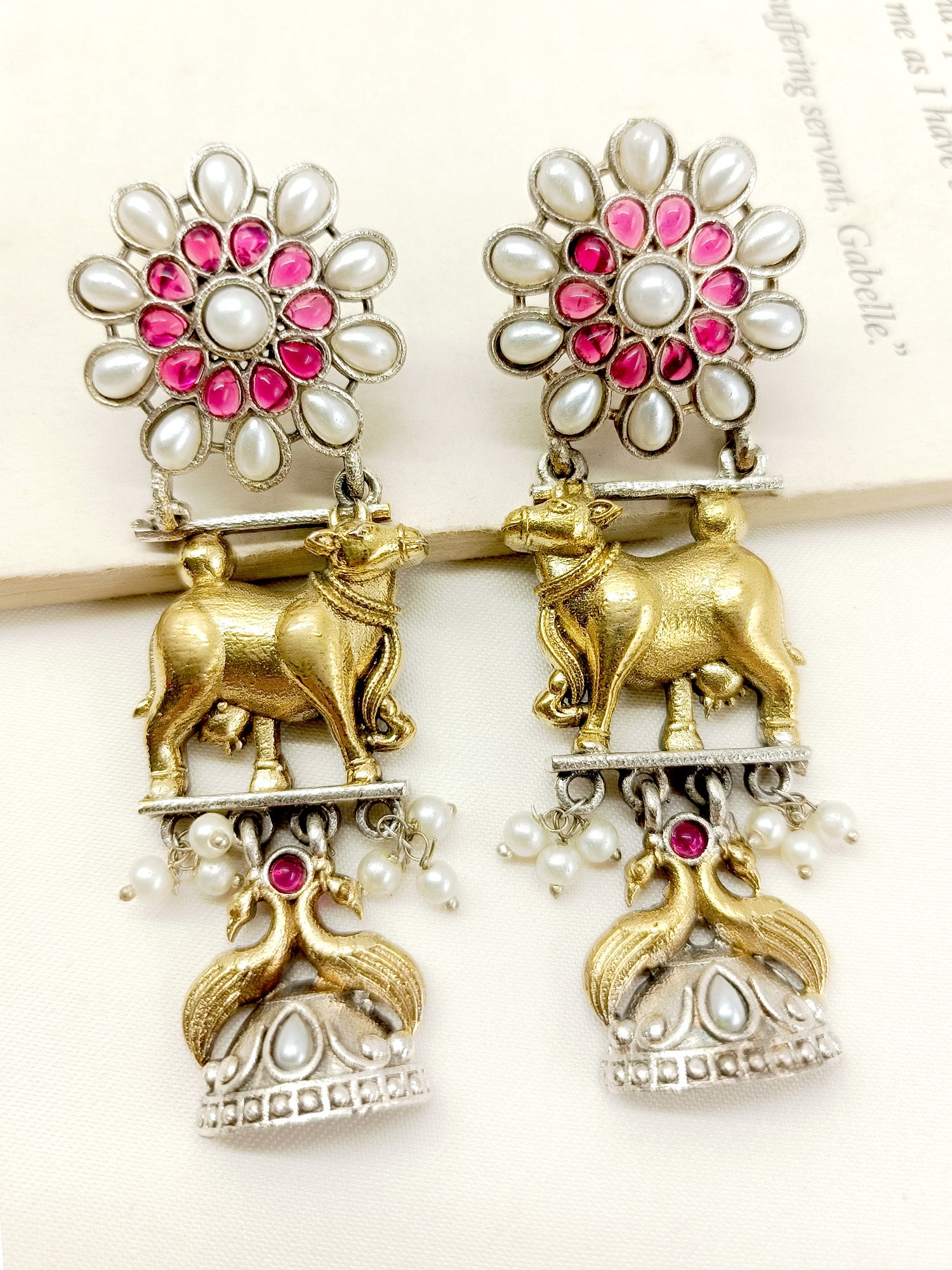 Introducing Oxidized Earrings. Made With Oxidized Silver Plated Brass Metal, These Long Earrings Feature Intricate Cow Motifs And Hanging Pearl. Elevate Your Style With These Unique And Beautifully Crafted Earrings That Add A Touch Of Elegance To Any Outfit. Perfect For Any Occasion. Order Yours Now.