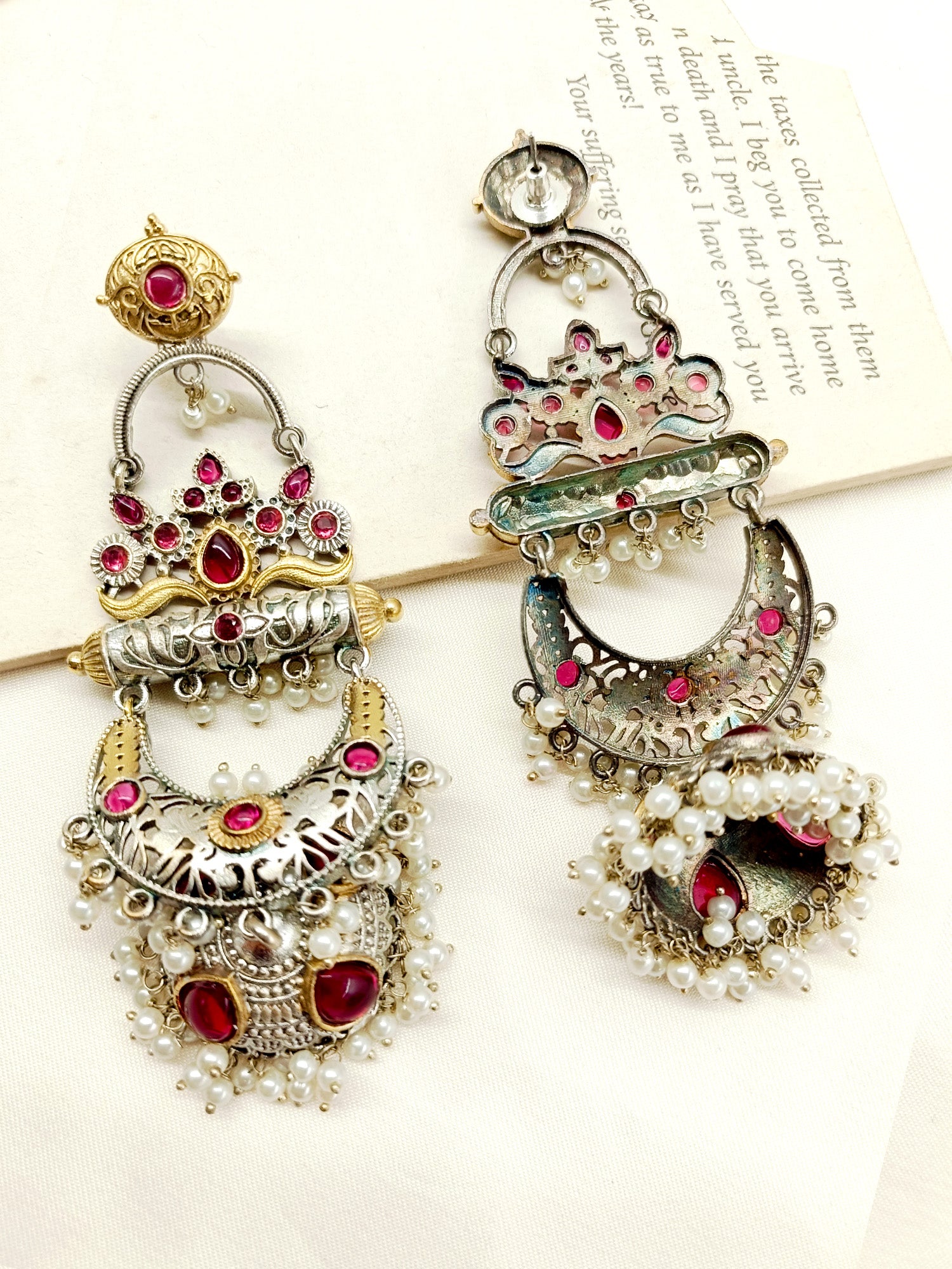 Crafted With Oxidized Silver Plated Brass Metal, These Oxidized Jhumki Feature Delicate Pearl Hanging. The Unique Oxidized Finish Adds A Touch Of Vintage Charm To These Versatile Earrings. Perfect For Any Occasion, They Make A Statement Of Sophistication And Style.