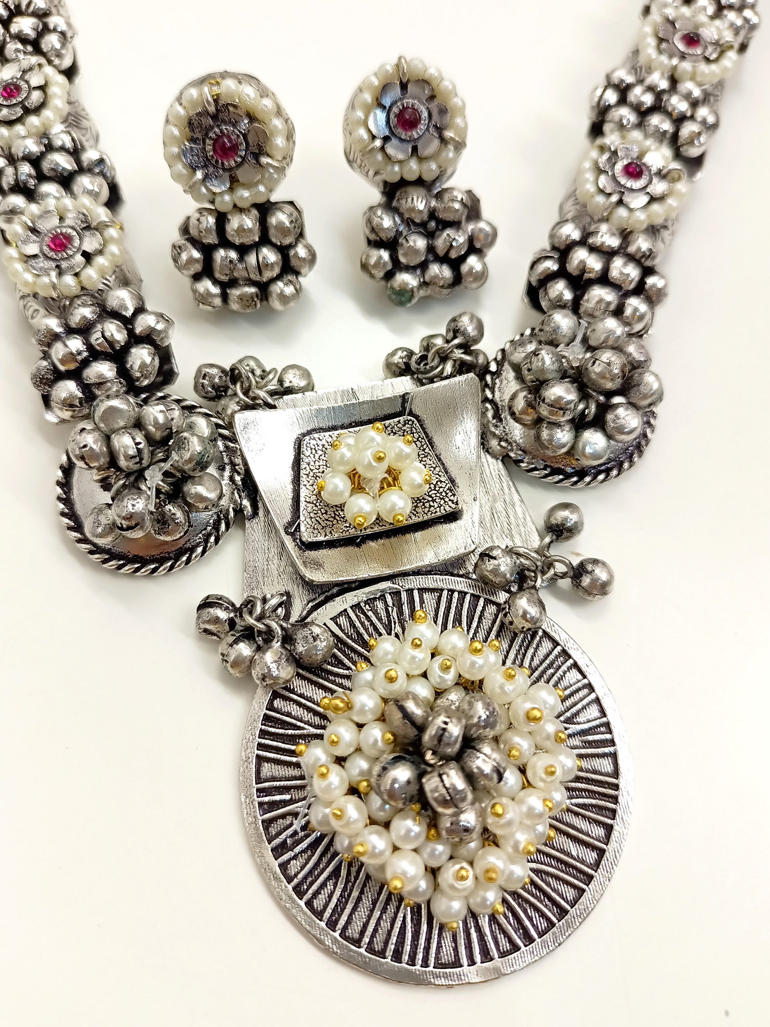 This Oxidized Set Is Perfect For Adding A Touch Of Tradition To Your Look. Crafted From Oxidized Silver Plated Brass Metal, This Beautiful Necklace Set Features Pearl Hanging. Perfect For Elevating Any Look.