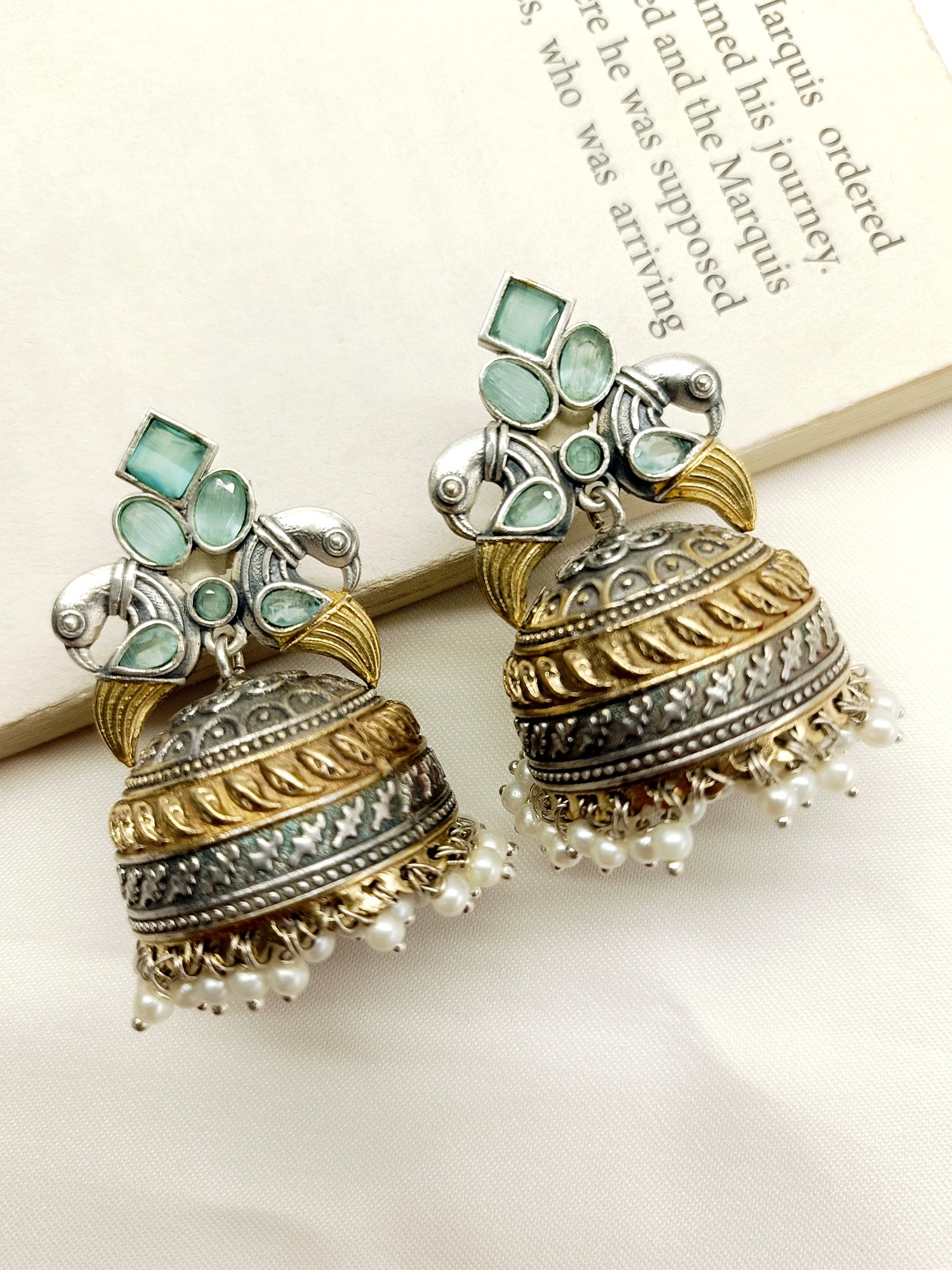 This Oxidized Jhumki Are Crafted From Oxidized Silver Plated Brass Metal, Giving Them A Unique And Stylish Look With Peacock Motifs. The Oxidized Finish Adds Depth And Contrast To The Beautiful Silver Color. Elevate Your Wardrobe With These Elegant Earrings.