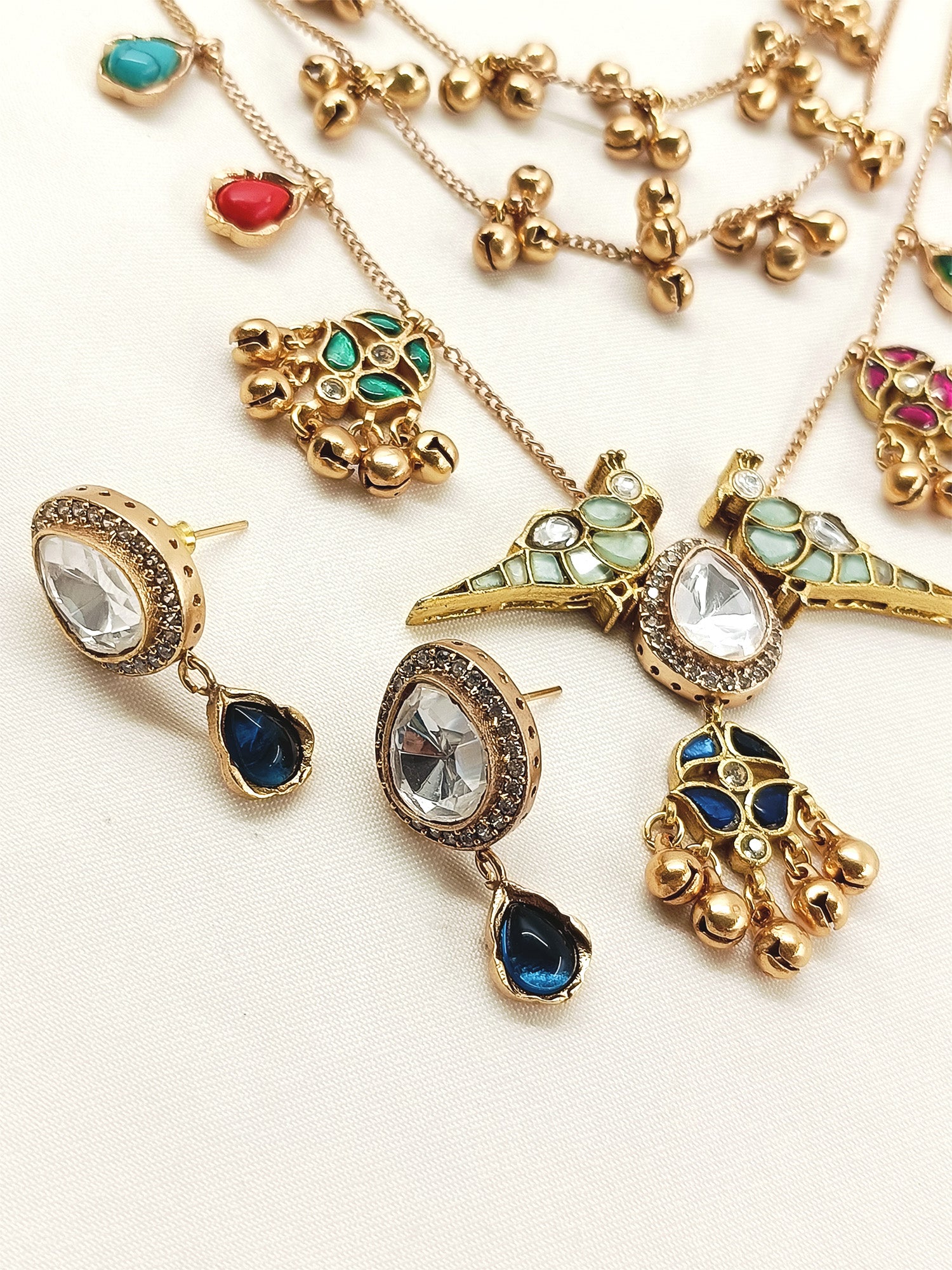 Add A Touch Of Traditional Elegance With Our Multi Colour Kundan Necklace Set. Handcrafted With Antique Gold Plating And Adorned With Ghungroo And American Diamond, This Necklace Set Features Multi Colour Semi-precious Stones For A Stunning And Sophisticated Look. Elevate Any Outfit With This Statement Piece.