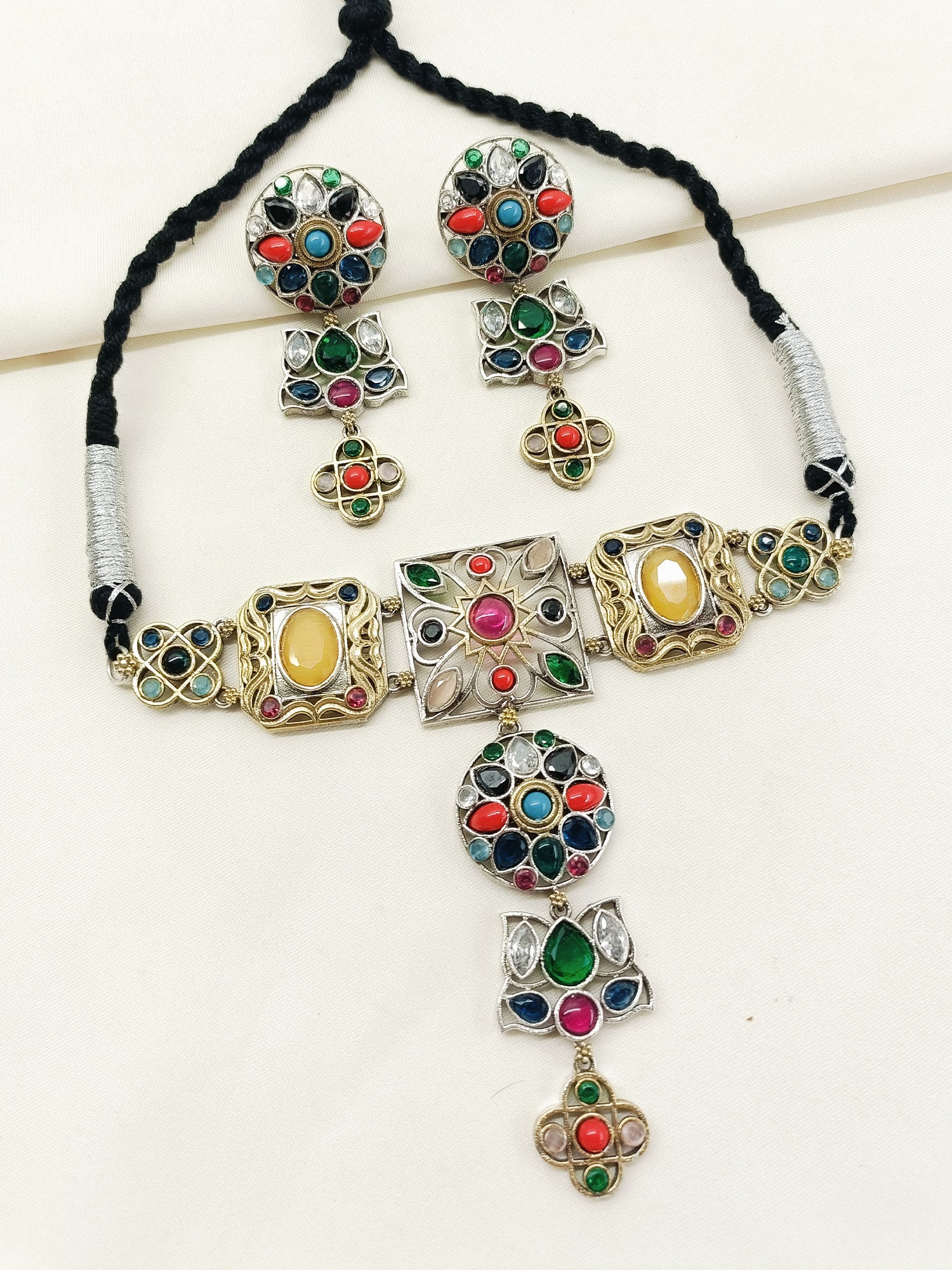 Elevate Your Style With This Multi Colour Oxidized Choker Set, Crafted From Oxidized Silver-plated Brass For A Vintage-inspired Look. Featuring Semi-precious Stones And Beads, This Set Offers A Unique Blend Of Durability And Elegance. Perfect For Adding A Sophisticated Touch To Both Casual And Formal Outfits.