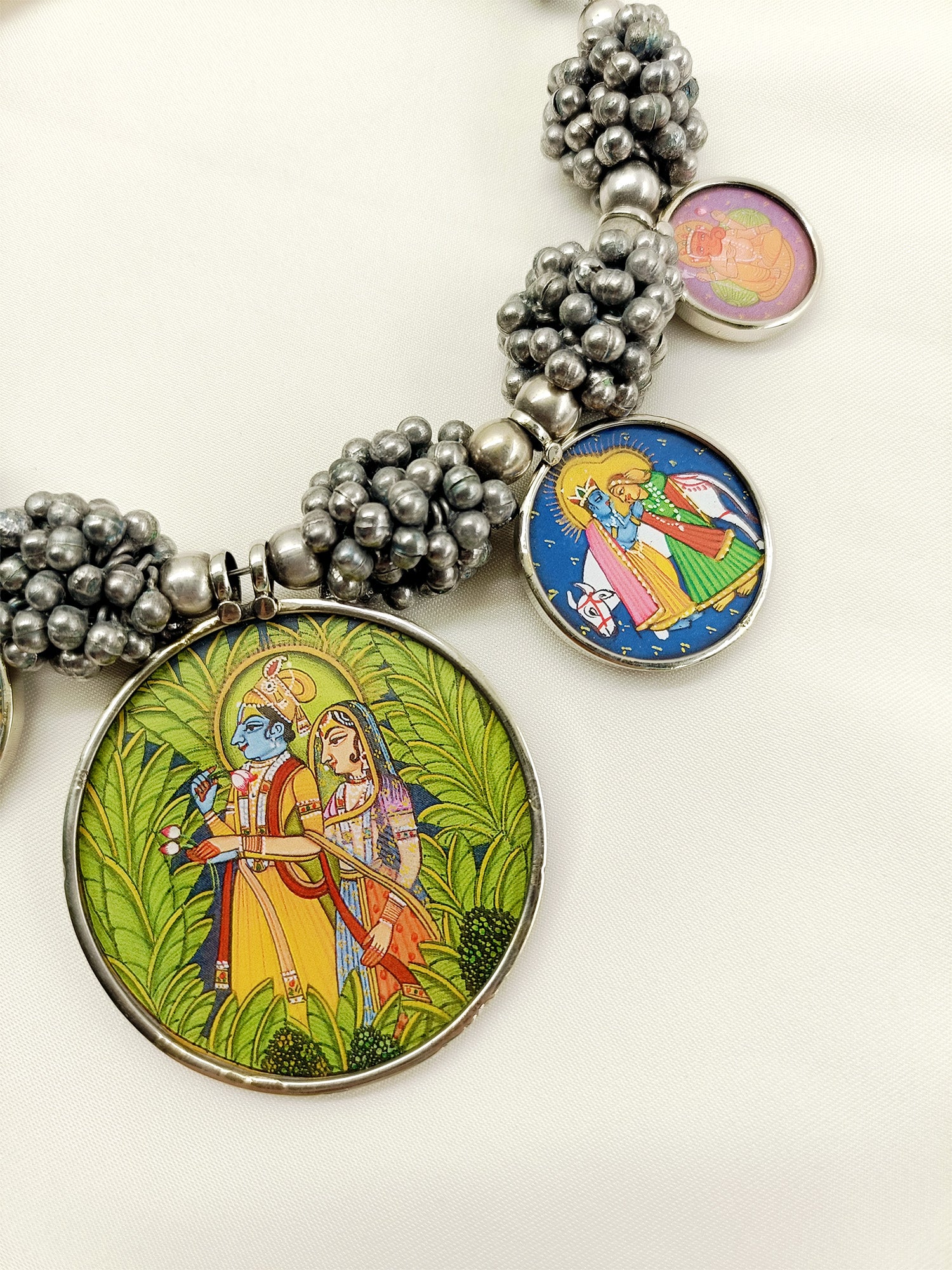 This Multi Colour Oxidized Neckpiece Is The Perfect Accessory For Any Occasion. Made With Oxidized Silver Plated Brass Metal And Adorned With Ghungroo, It Adds A Touch Of Elegance To Any Outfit. Its Unique Design And High Quality Materials Make It A Must-have For Any Fashion Enthusiast.