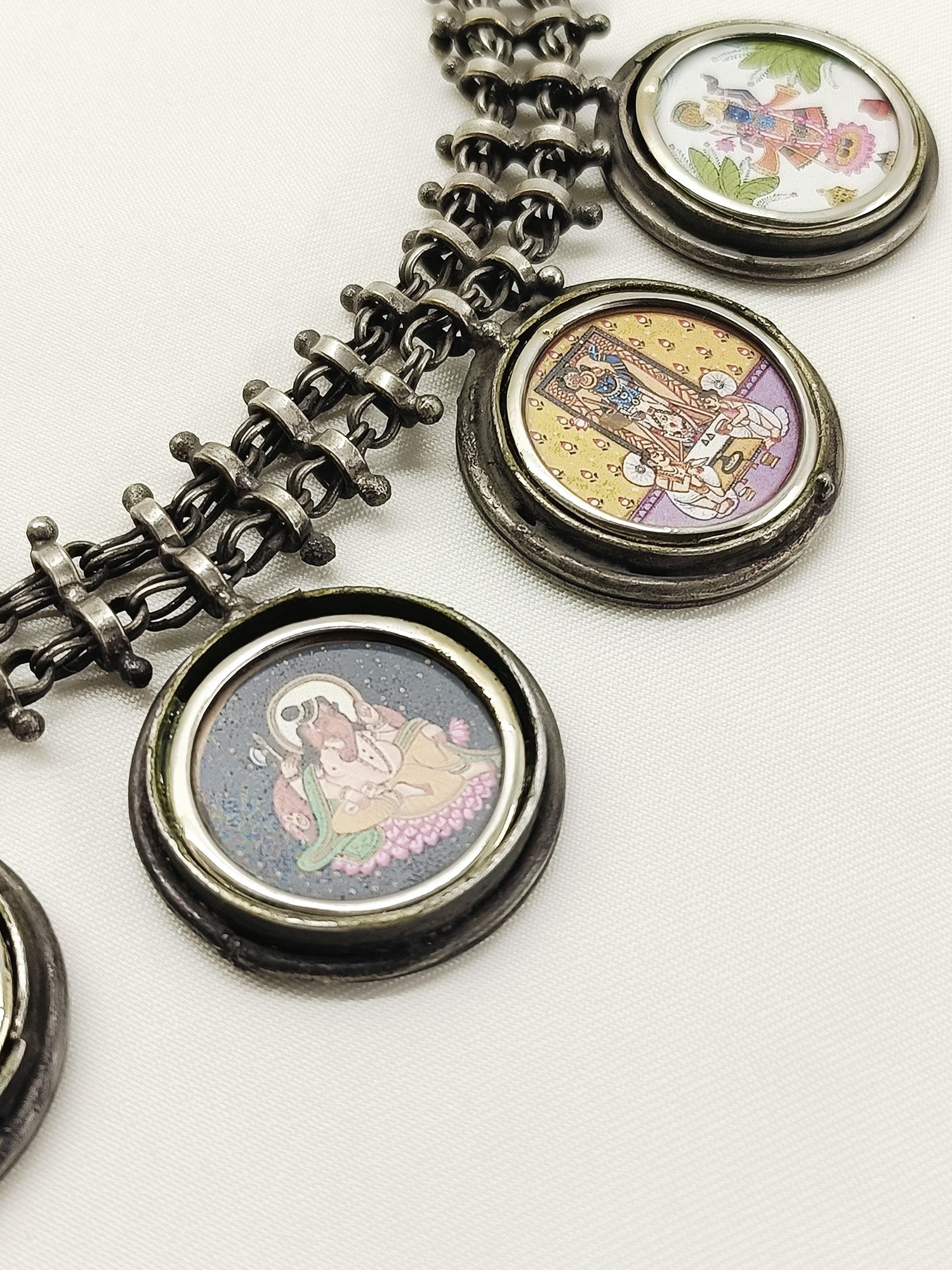 This Multi-colour Oxidized Neckpiece Is Crafted From Silver-plated Brass Metal, Featuring Intricate Depictions Of Ganesh Ji, Radha-krishna Ji, And Srinath Ji. Its Oxidized Finish Enhances The Traditional Aesthetic, Making It A Distinctive Accessory That Reflects Cultural Heritage With Expert Craftsmanship. Ideal For Those Seeking A Meaningful And Artistic Statement Piece.