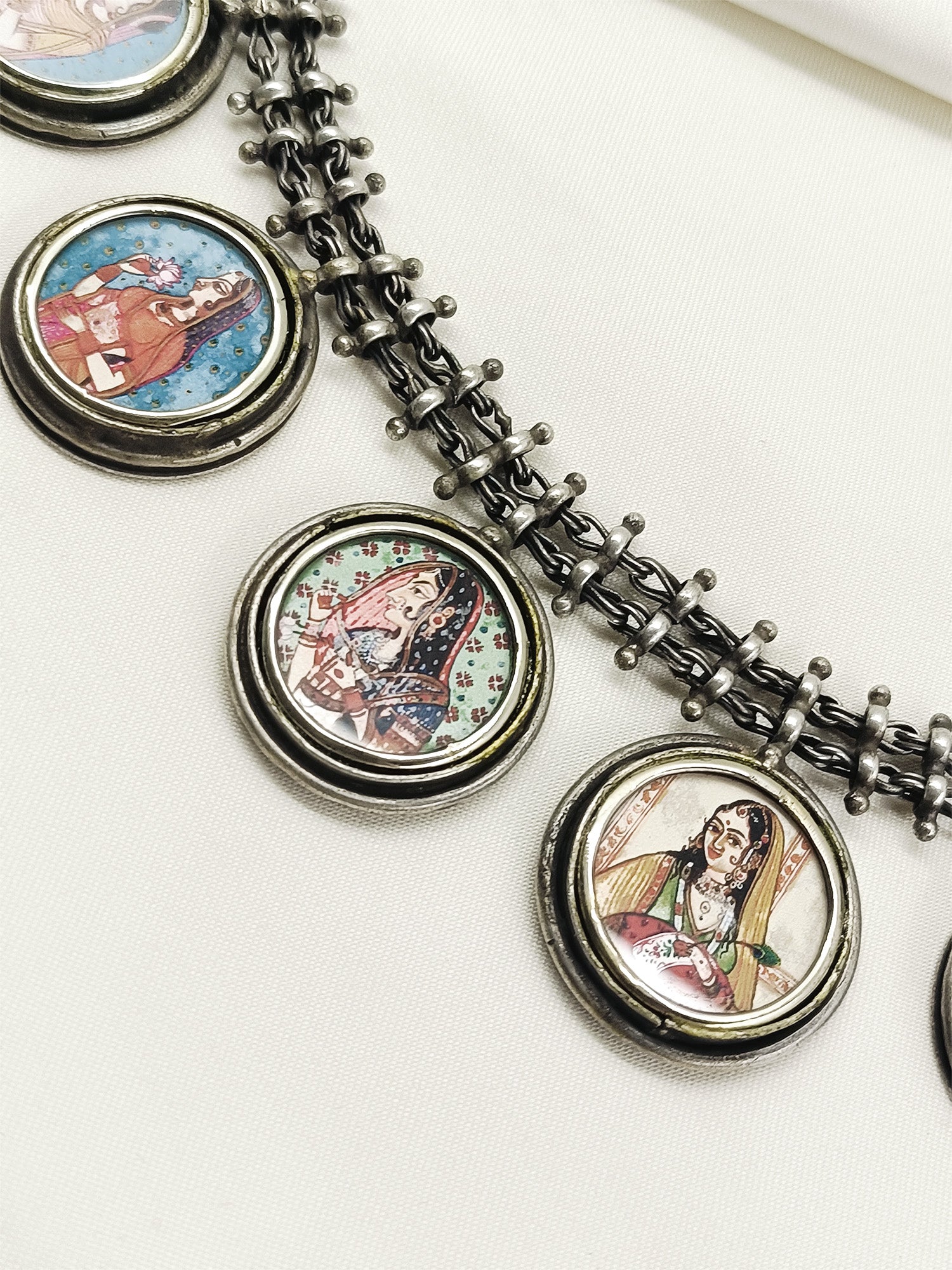This Multi-colour Oxidized Neckpiece Is Crafted From Silver-plated Brass Metal With An Oxidized Finish, Offering A Vintage Appeal. Featuring Traditional Painting Techniques, It Combines Intricate Artistry With Durable Materials, Making It A Distinctive Accessory That Enhances Ethnic And Contemporary Outfits Alike.