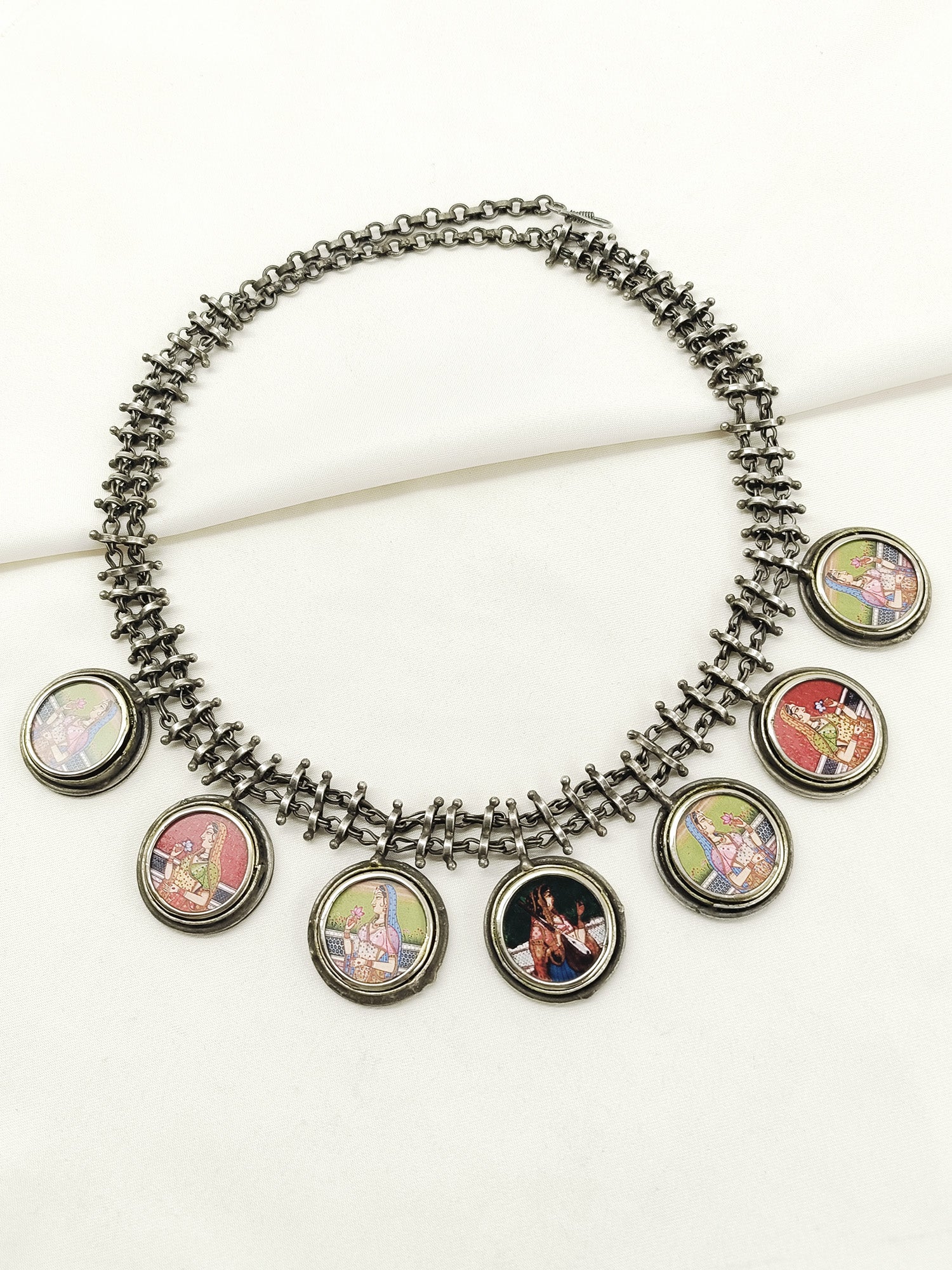 This Multi-colour Oxidized Neckpiece Is Crafted From Silver-plated Brass Metal With An Oxidized Finish, Offering A Vintage Appeal. Featuring Traditional Painting Techniques, It Combines Intricate Artistry With Durable Materials, Making It A Distinctive Accessory That Enhances Ethnic And Contemporary Outfits Alike.