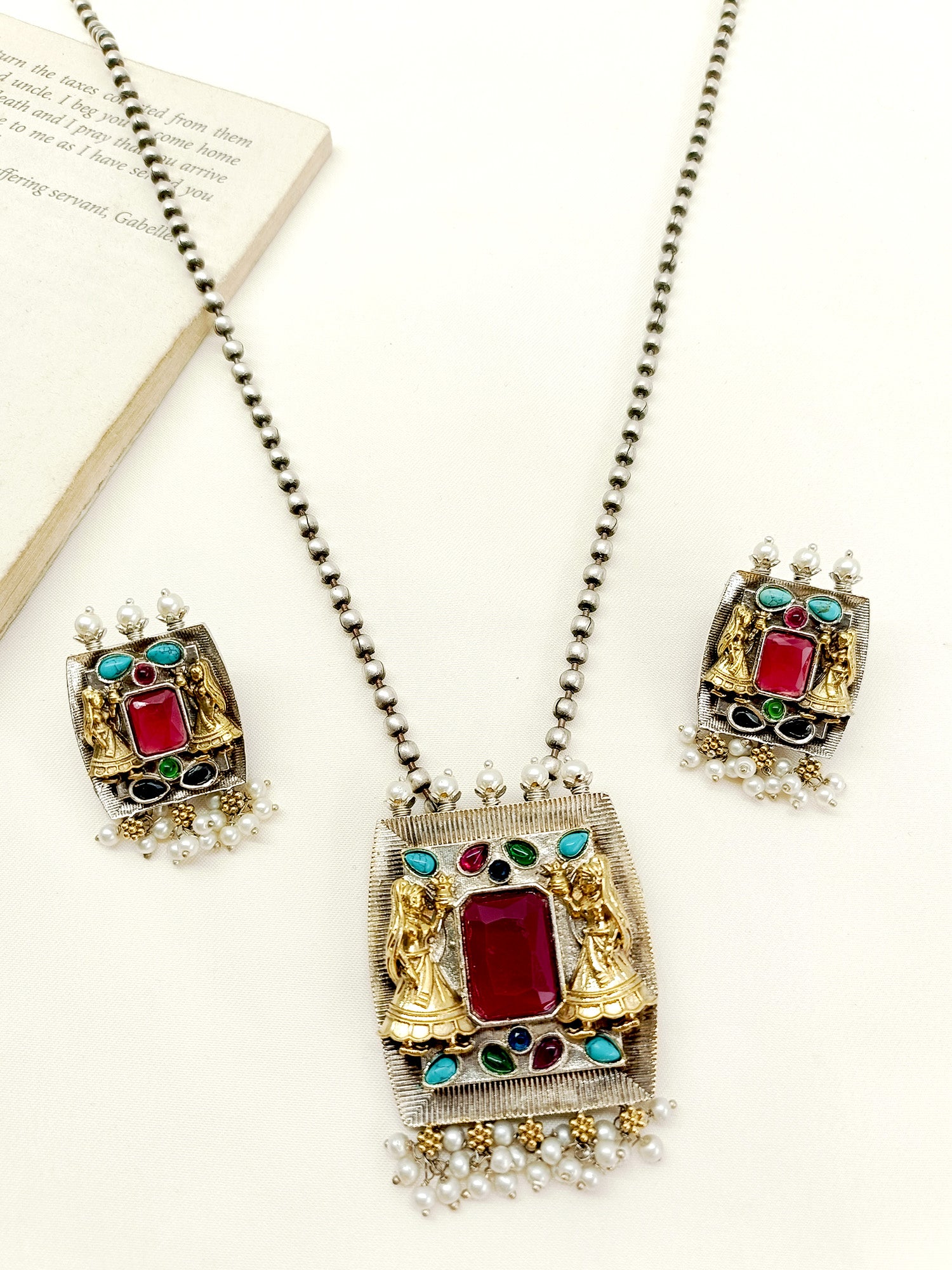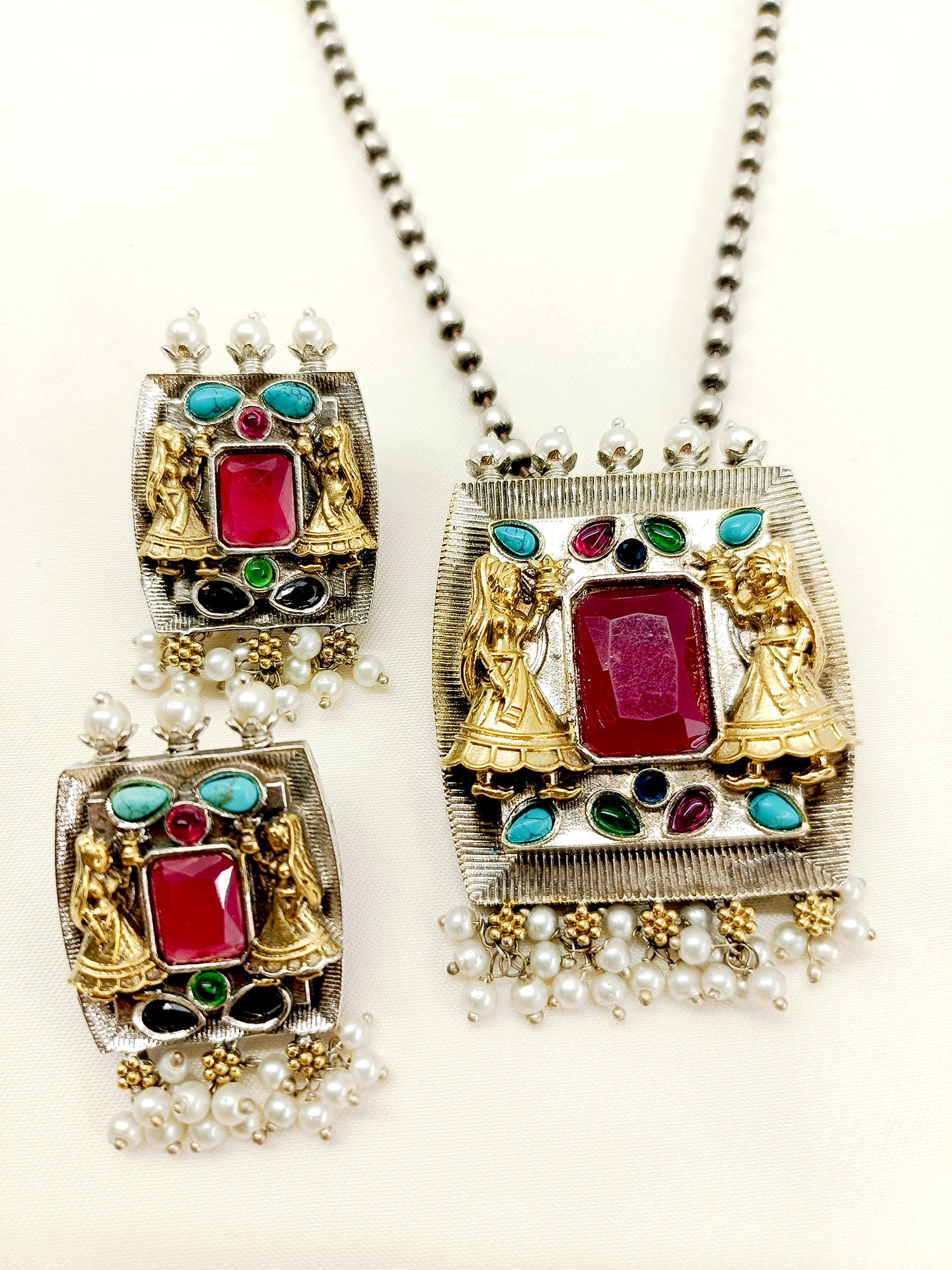 This Elegant Oxidized Pendant Set Silver Plated Brass Metal. Perfect For Adding A Touch Of Traditional And Spiritual Elements To Your Wardrobe. Made With High-quality Materials For Durability And Long-lasting Wear.