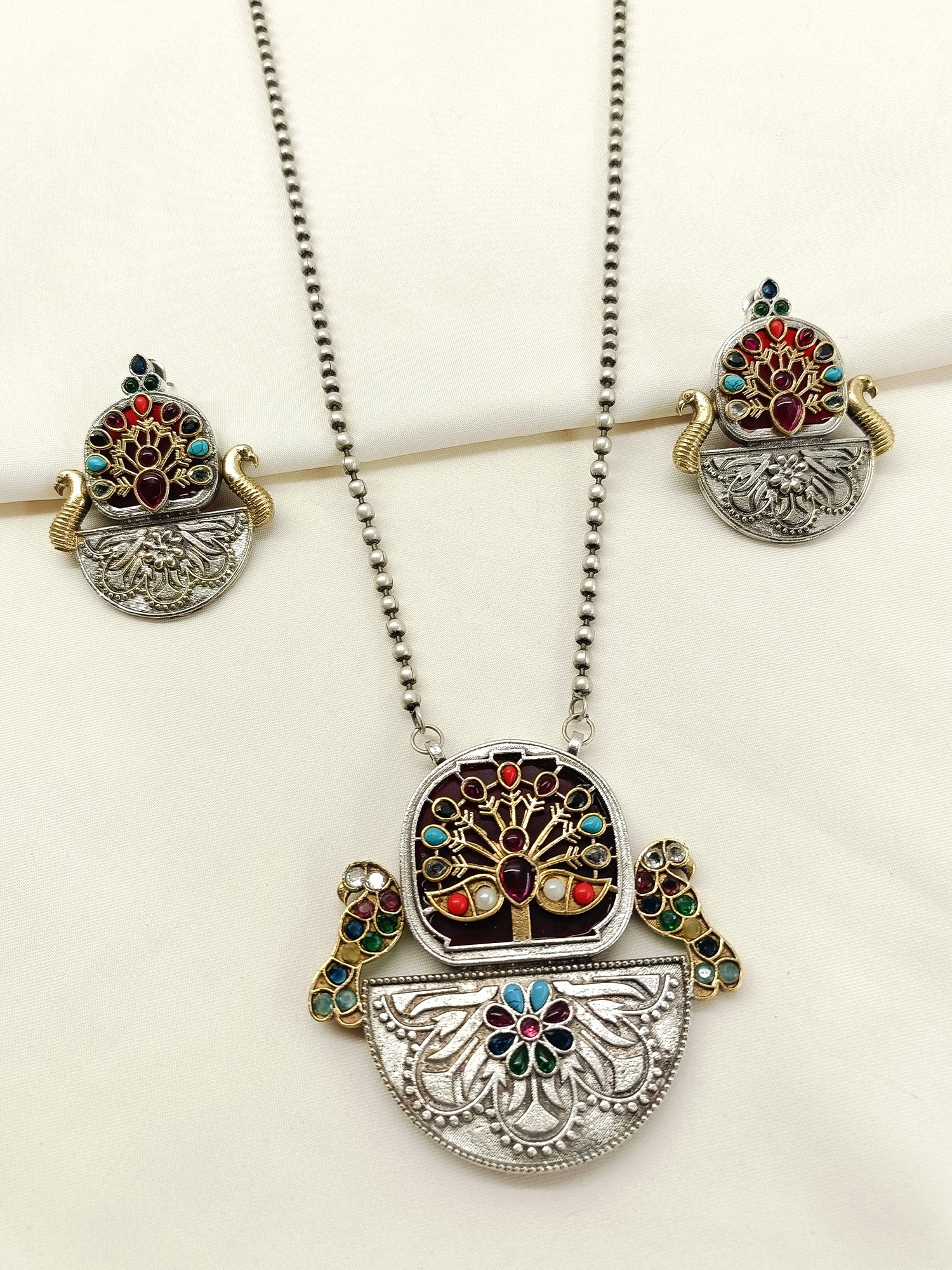 Elevate Your Style With This Expertly Crafted Multi Colour Oxidized Pendant Set. Featuring Oxidized Silver Plating, It Offers A Vintage Charm While Ensuring Durability. The Inclusion Of Semi-precious Stones Adds A Subtle Yet Captivating Splash Of Color, Making It Perfect For Both Casual And Formal Occasions. This Set Combines Traditional Craftsmanship With Contemporary Design, Providing A Unique Accessory That Enhances Any Outfit With Sophistication And Timeless Appeal.