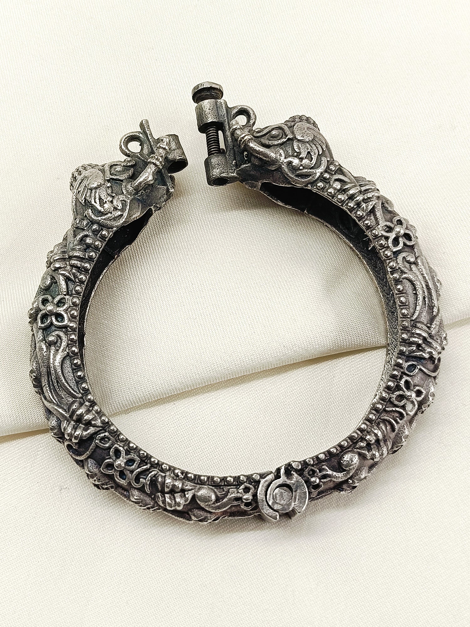 This Openable Oxidized Kada Showcases Exquisite Fencing Elephant Detailing, All Crafted From Oxidized Silver Plated Brass Metal. Elevate Your Look With This Timeless Piece, Perfect For Any Occasion. Expertly Designed For A Sophisticated And Classic Aesthetic.