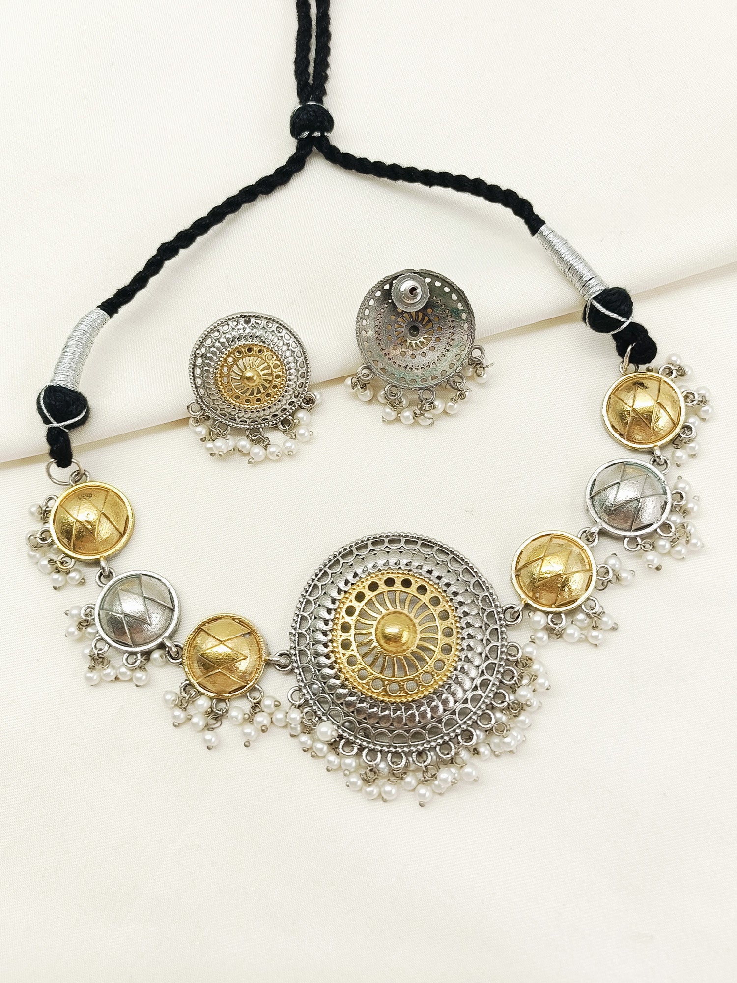 This Plain Oxidized Necklace Set Features A Sophisticated Blend Of Oxidized Silver And Gold-plated Brass, Offering Durability With A Vintage Appeal. Accented By Delicately Hanging Pearls, It Adds An Elegant Touch To Any Outfit. Expertly Crafted, This Set Balances Traditional Design With Contemporary Style, Making It A Versatile Accessory For Both Casual And Formal Occasions.