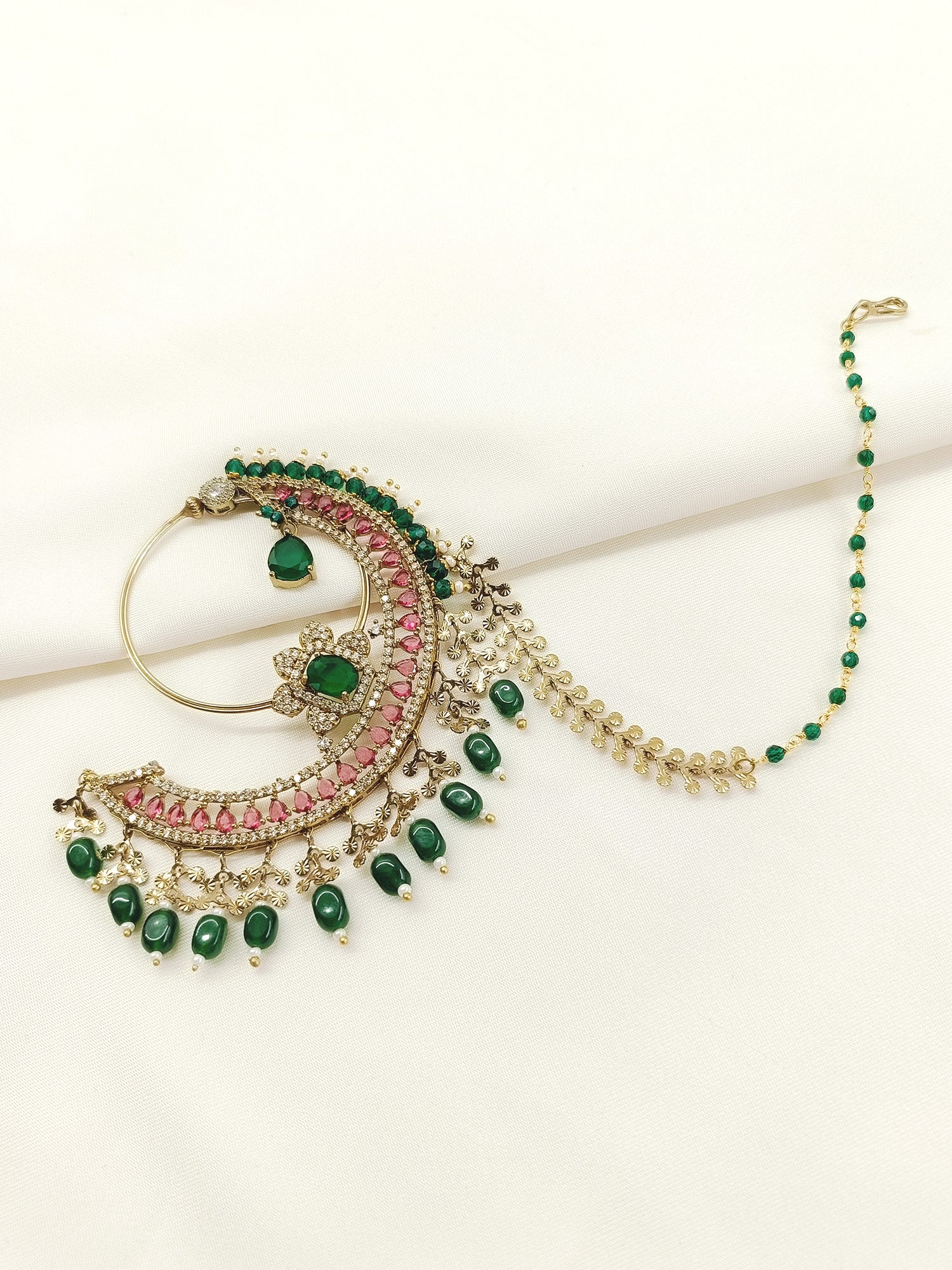 This R&G Antique Nath Showcases Masterful Artisanal Design With Antique Gold-plated Brass Construction, Delivering Authentic Vintage Aesthetics. Semi-precious Stones Paired With Cascading Beads Create Dimensional Visual Interest, While American Diamond Accents Provide Luminous Sophistication. The Intricate Detailing Reflects Traditional Indian Jewelry Heritage, Making It An Ideal Choice For Ceremonial Occasions Or Discerning Collectors Seeking Genuine Craftsmanship. A Versatile Investment Piece That Transcends Seasonal Trends.