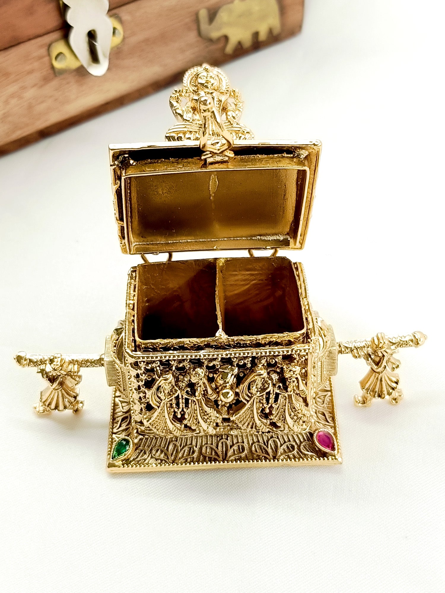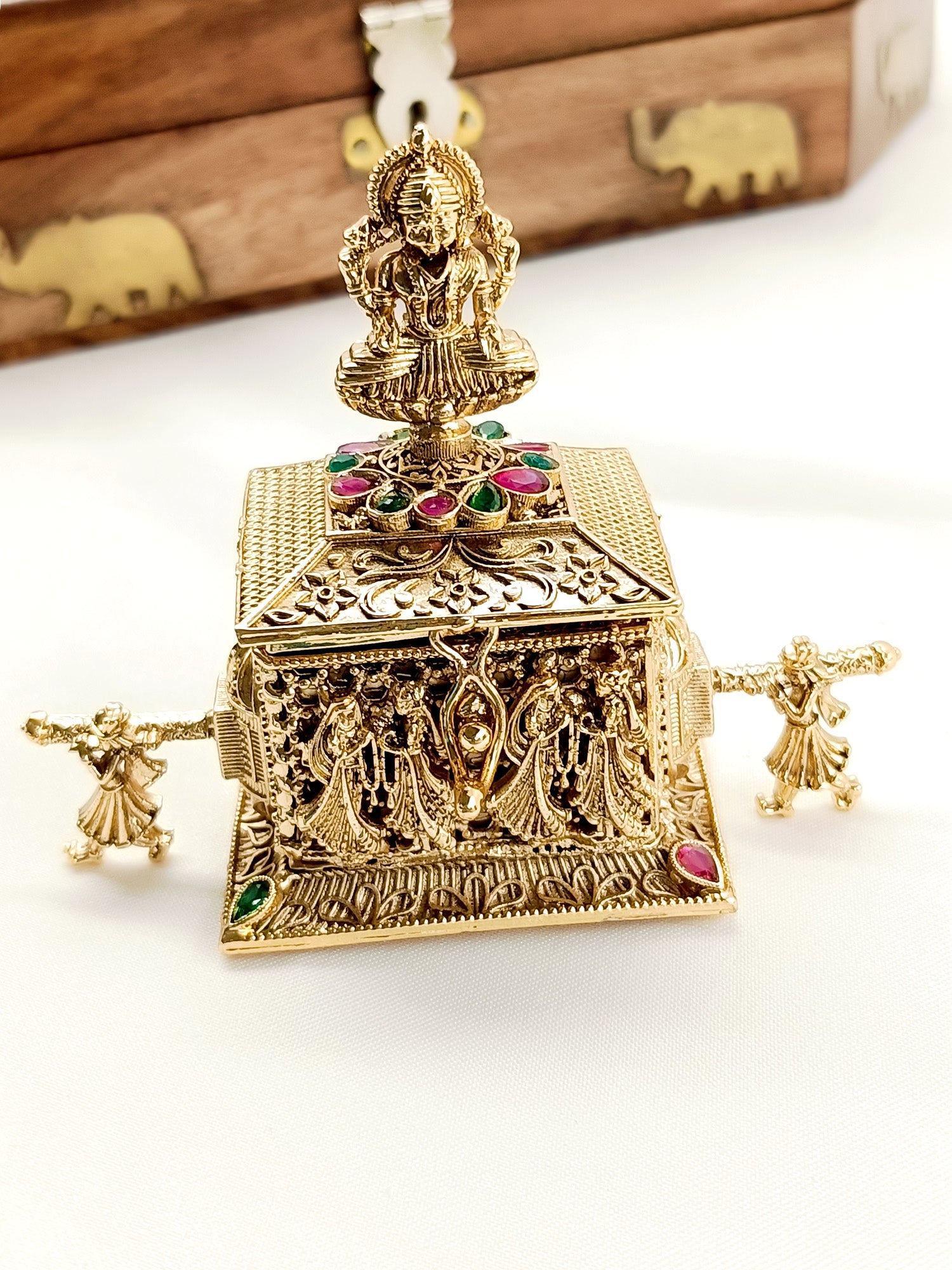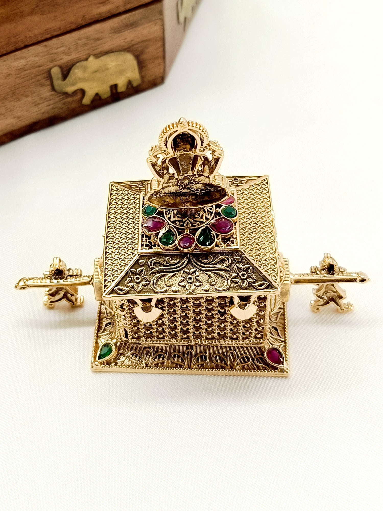 The R&G Antique Temple Sindoor Dibbi Is A Beautifully Crafted Sindoor Dibbi Made Of Antique Gold Plated Brass Metal. The Intricate Detailing Features A Palki And A Laxmi Ji Design, Adding A Touch Of Elegance. Perfect For Traditional Weddings And Special Occasions.