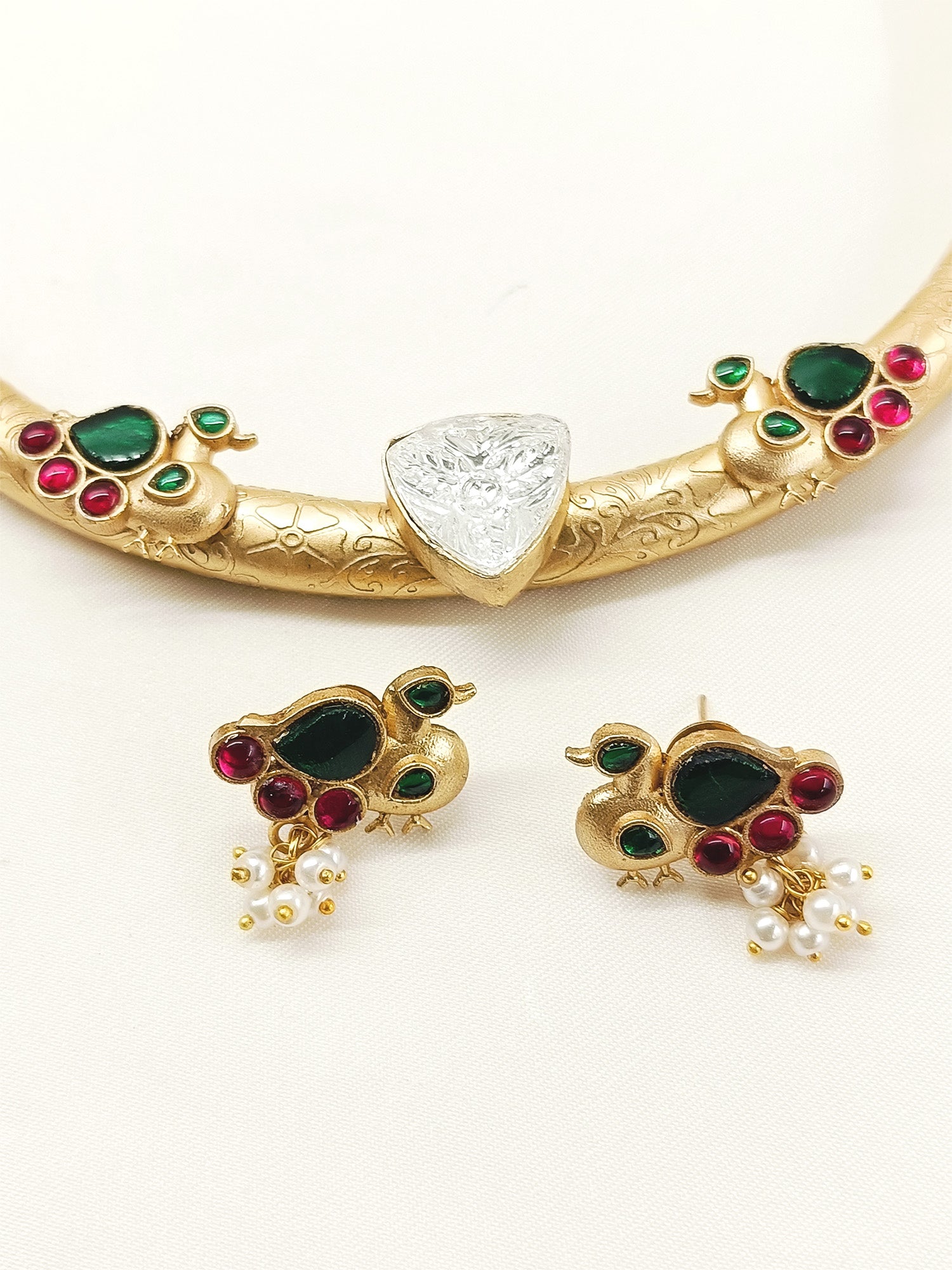 Elevate Your Ensemble With The Boutique Hasli Styled Choker Set, Expertly Crafted From Brass Metal With A Rich Gold Plating. This Statement Piece Features Carefully Selected Natural Stones That Enhance Its Traditional Allure While Ensuring Durability. Ideal For Adding A Distinguished, Cultural Touch To Both Formal And Festive Attire, This Choker Set Combines Timeless Craftsmanship With Sophisticated Design.
