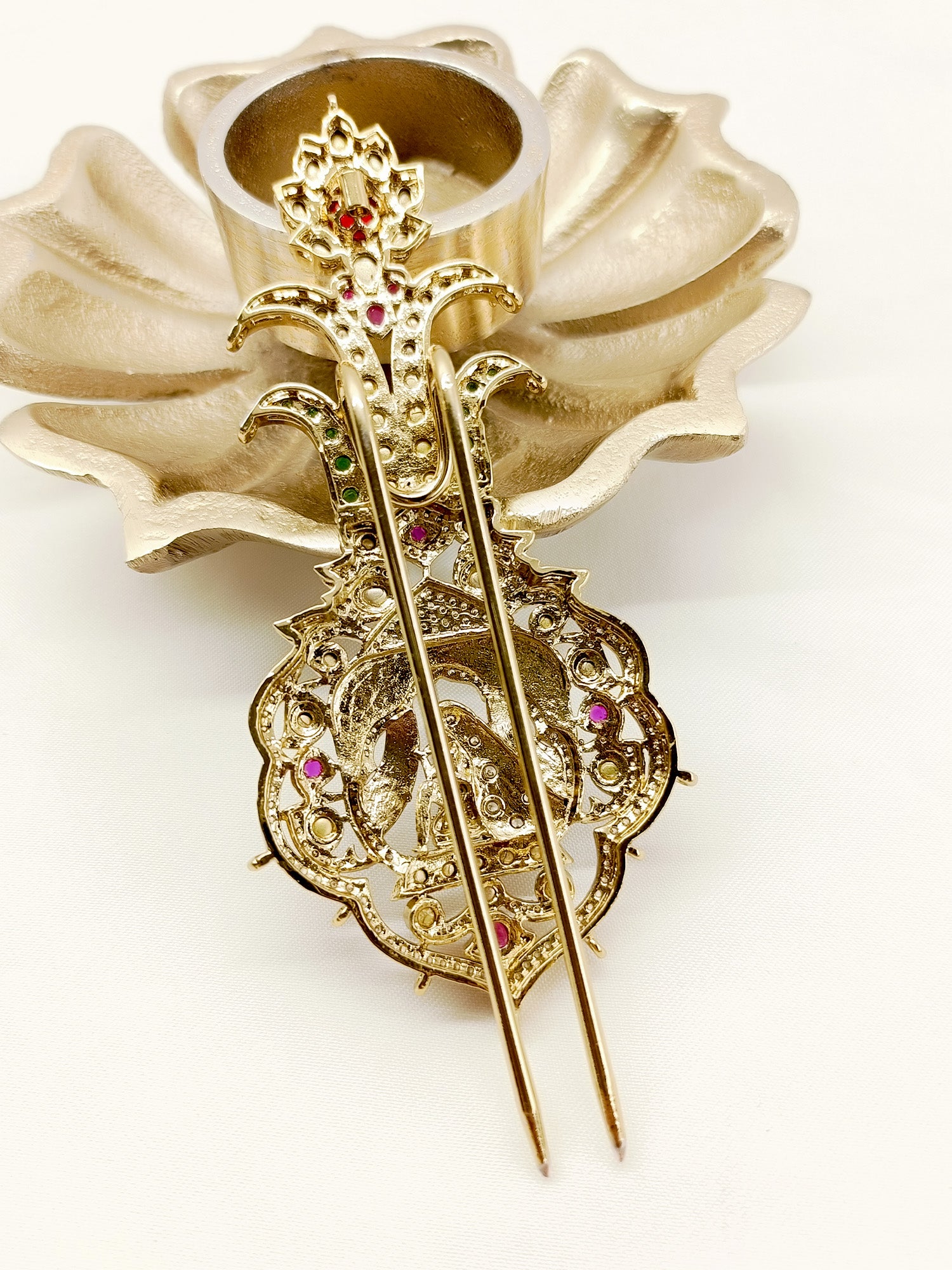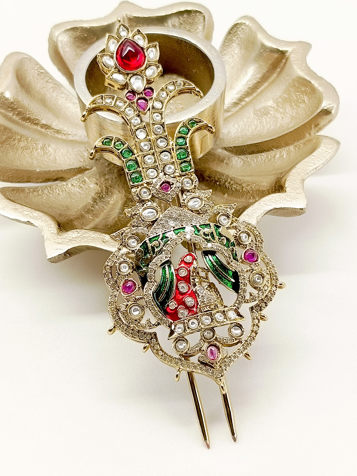 Elevate Your Wedding Look With The R & G Dulha Kalgi. Made Of Antique Gold Plated Brass Metal, This Kalgi Is Embellished With Kundan, American Diamond, And Ruby Semi-precious Stones. With Its Intricate Design And Quality Materials, It Adds A Touch Of Elegance And Luxury To Your Attire.