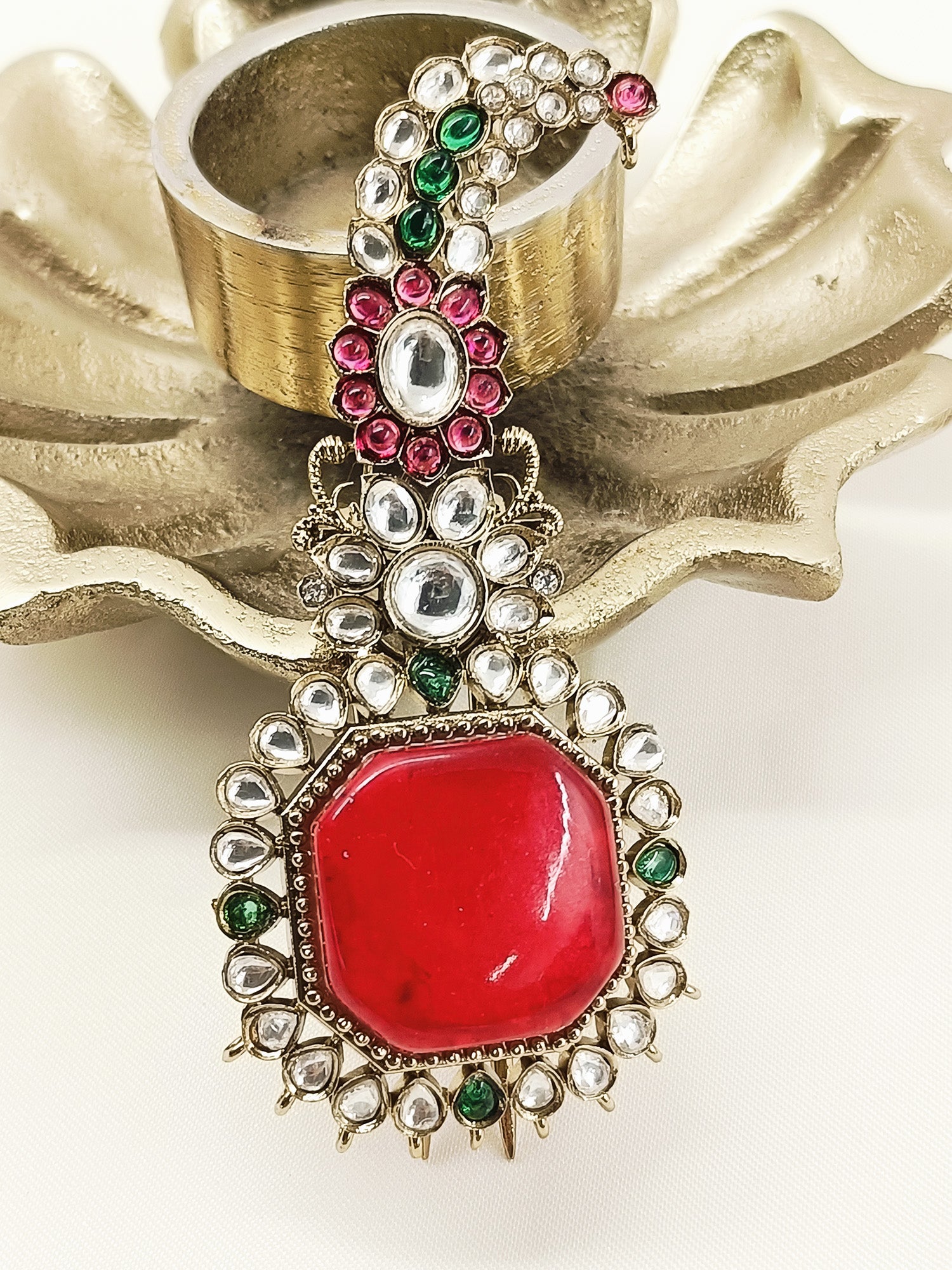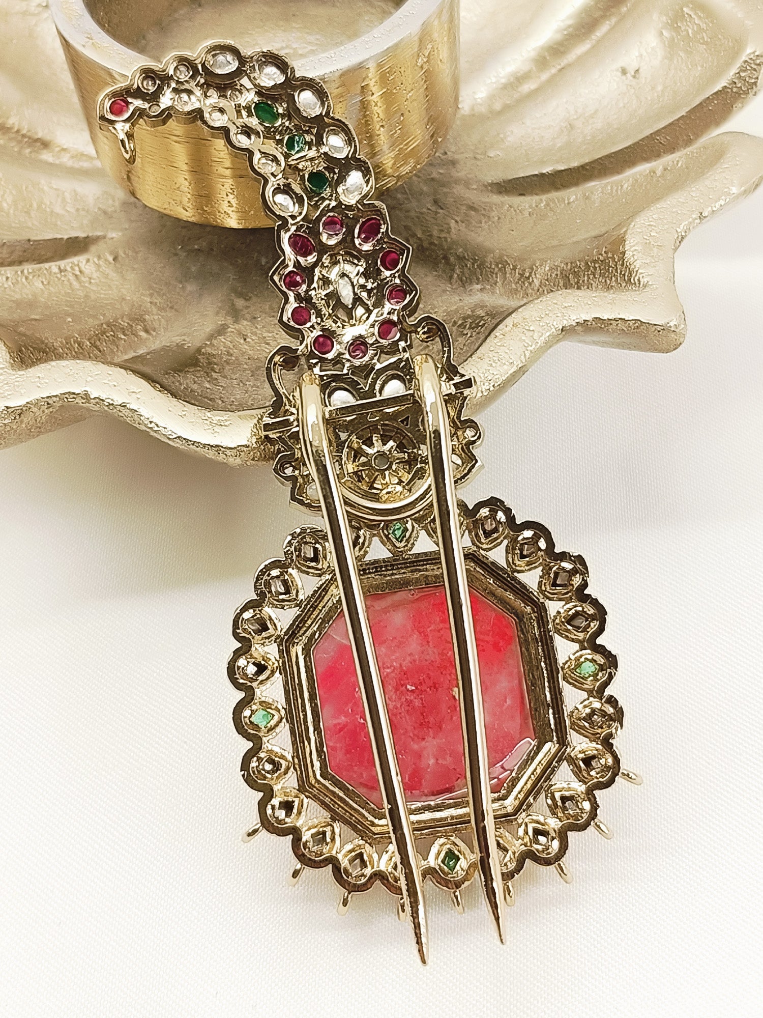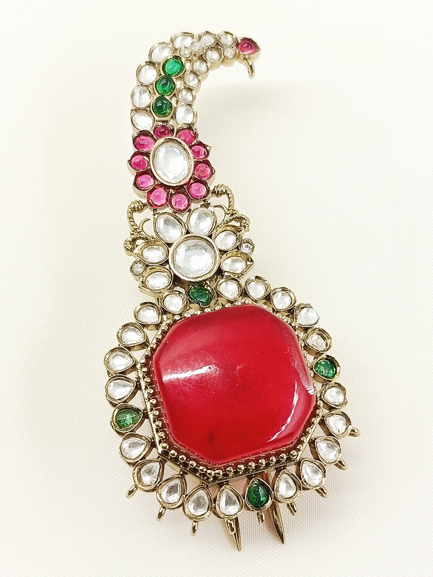 Anokha R&G Dulha Kalgi Showcases Intricate Antique Gold Plating On Durable Brass Metal, Adorned With Semi-precious Stones, American Diamonds, And Ruby Moissanite. This Carefully Crafted Kalgi Adds A Regal Touch To Wedding Attire, Blending Traditional Elegance With Lasting Quality And Brilliance. Ideal For Enhancing The Groom’s Ensemble With Expert Craftsmanship And Timeless Style.