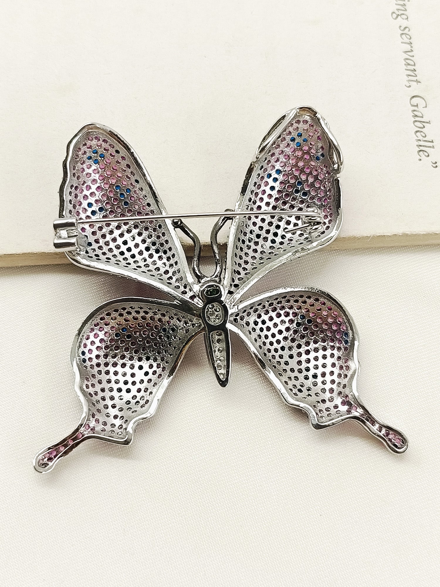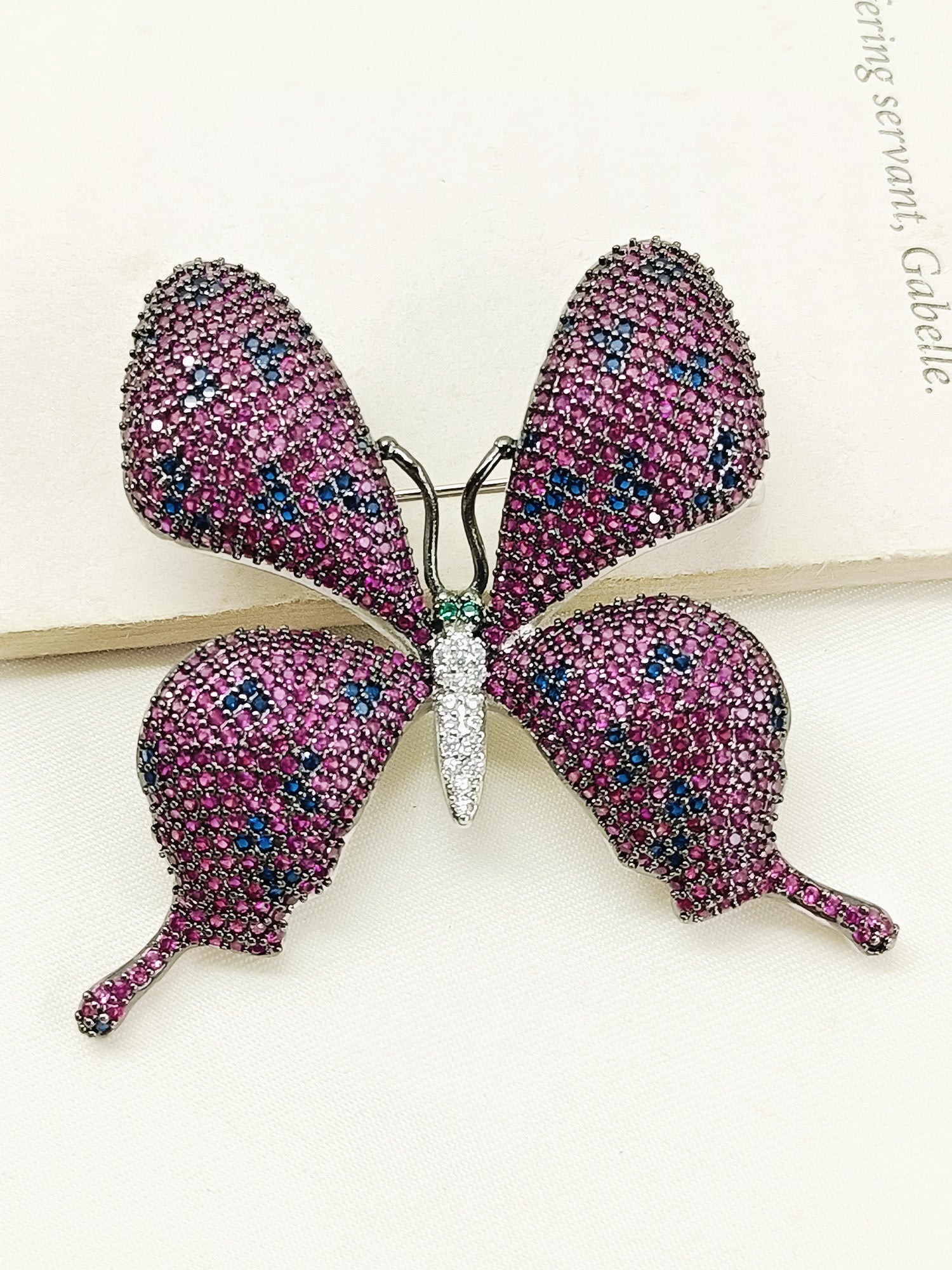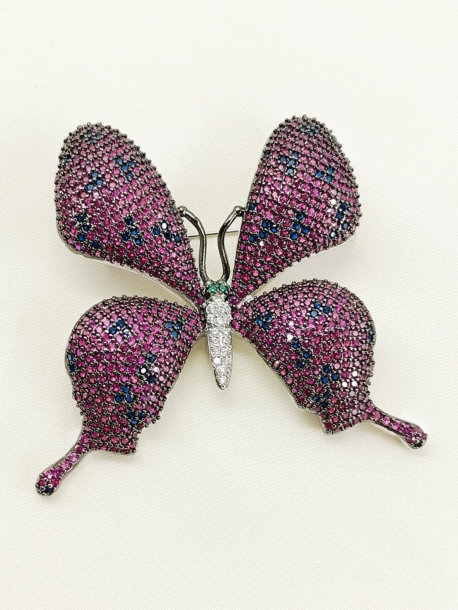 This Ruby Butterfly Brooch Features A Refined Black Polish Finish That Enhances Its Elegant Design. Adorned With Sparkling American Diamonds And A Delicate Small Moissanite Stone, It Offers A Subtle Yet Sophisticated Shimmer. Perfect For Adding A Touch Of Expert Craftsmanship And Timeless Charm To Any Outfit.