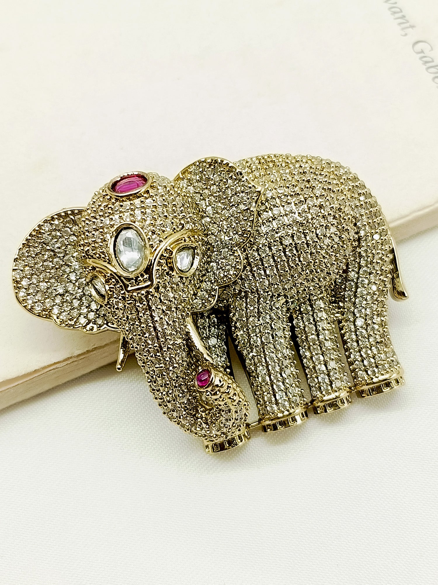This Victorian-inspired Brooch Is A True Statement Piece, Featuring Antique Gold Plating And Intricate Kundan And American Diamond Detailing, Accented By A Bold Ruby Center Stone. Crafted With Quality Brass Metal, It Adds A Touch Of Elegance To Any Outfit. Embrace Timeless Style With Our White Elephant Brooch.