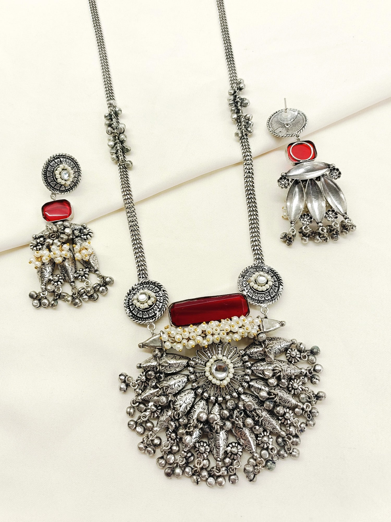 This Ruby Oxidized Pendant Set Features An Oxidized Silver-plated Brass Base, Elegantly Accented With Pearls And Adorned Stones For A Refined Look. The Addition Of Ghunghroo Enhances Its Traditional Charm, Making It A Perfect Accessory For Festive Occasions Or Ethnic Wear. Durable And Stylish, This Set Combines Classic Craftsmanship With Contemporary Design.