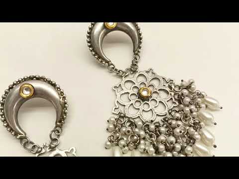 Bhagwati Silver Oxidized Earrings With Pearl Hangings