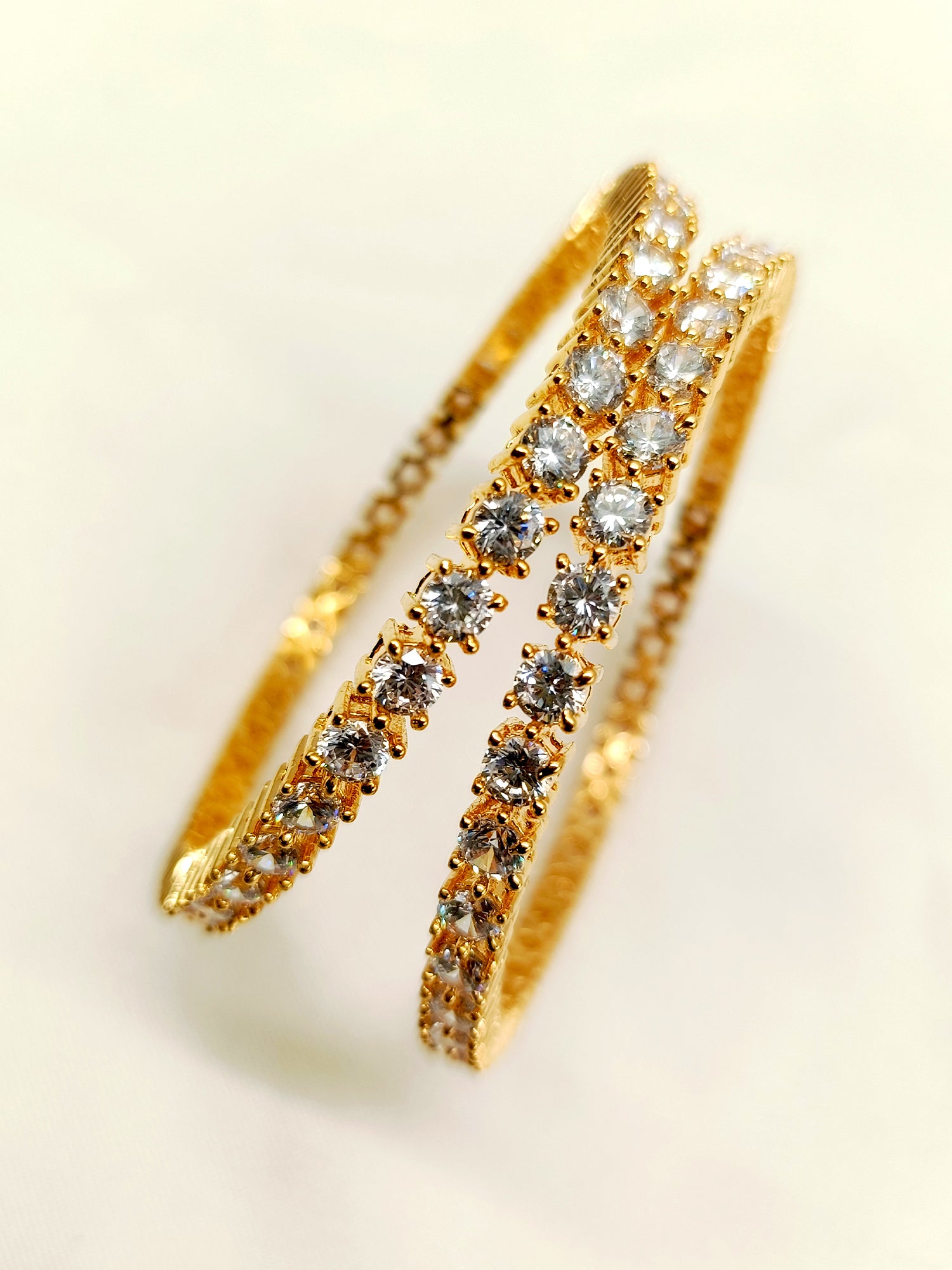 Discover Timeless Sophistication With These White American Diamond Bangles, Engineered From Gold-plated Brass To Provide Exceptional Durability And Radiance. The Carefully Selected American Diamonds Showcase Brilliant Sparkle And Clarity, Offering The Refined Aesthetic Of Luxury Jewelry With Practical Everyday Wearability. The Protective Gold Plating Maintains Its Lustrous Finish Through Regular Use, While The Thoughtfully Designed Construction Ensures Comfort During Extended Wear. These Bangles Represent An Intelligent Investment For Those Seeking Authentic Elegance Without Compromise, Suitable For Both Formal Occasions And Refined Daily Styling.
