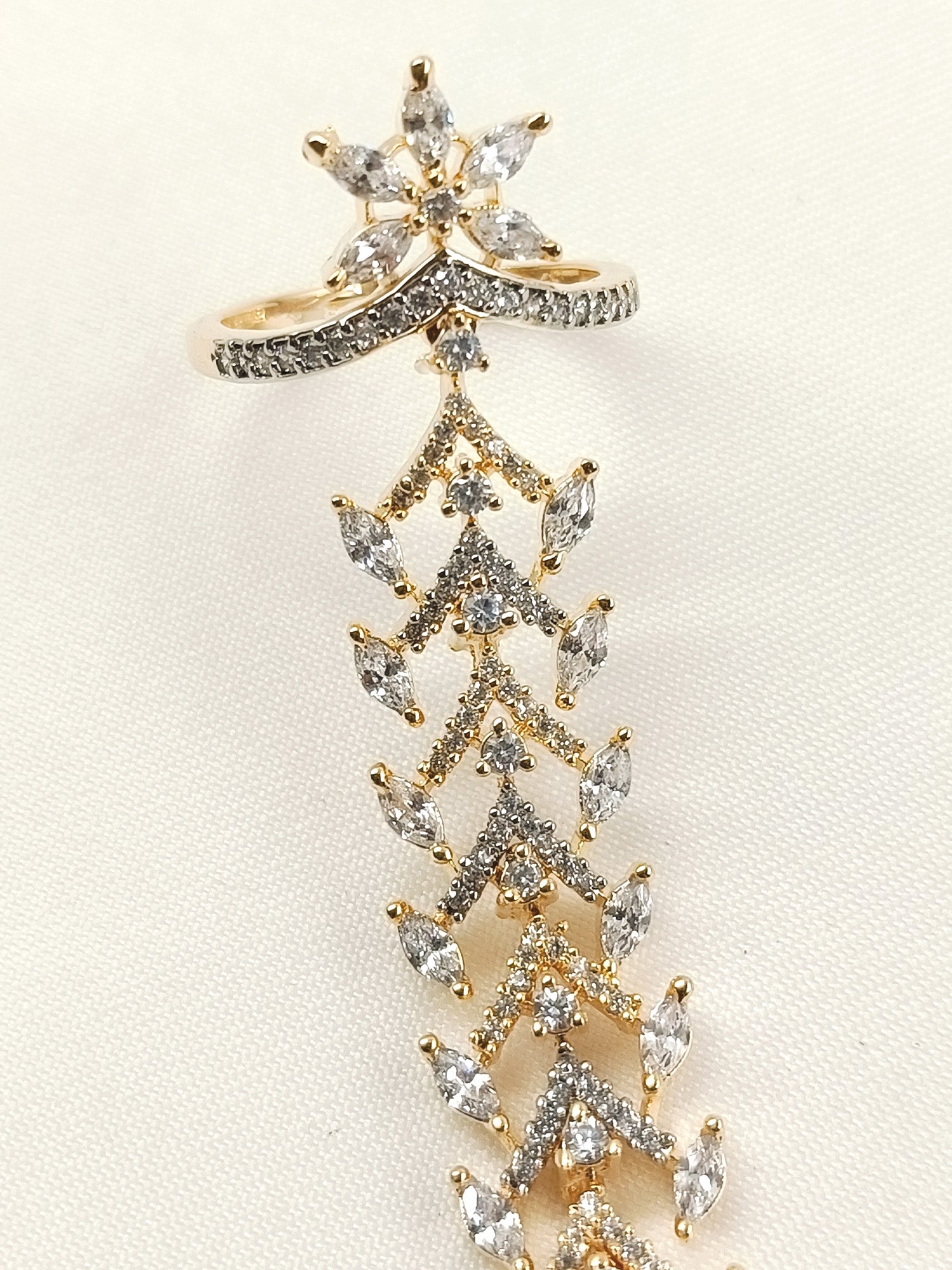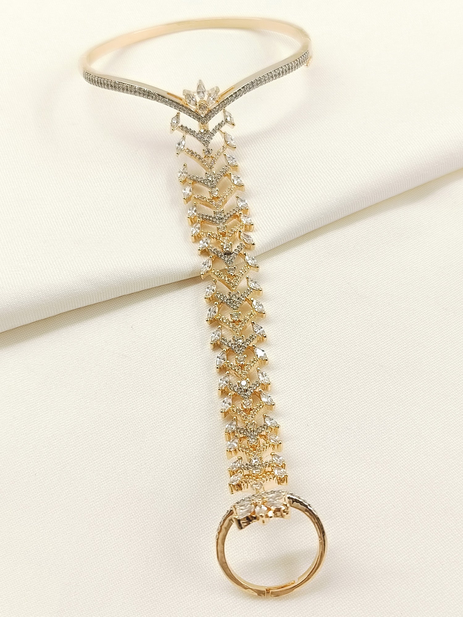 Elevate Your Hand Jewelry Collection With This Exquisite White American Diamond Hathphool. Crafted From Premium Brass Metal With Lustrous Gold Plating, This Piece Combines Durability With Timeless Elegance. The Brilliant White American Diamonds Catch Light Beautifully, Creating A Sophisticated Sparkle Perfect For Both Everyday Wear And Special Occasions. The Traditional Hathphool Design Adds Cultural Charm While The Quality Materials Ensure Lasting Radiance. An Ideal Choice For Those Seeking Affordable Luxury Without Compromising On Style Or Brilliance.