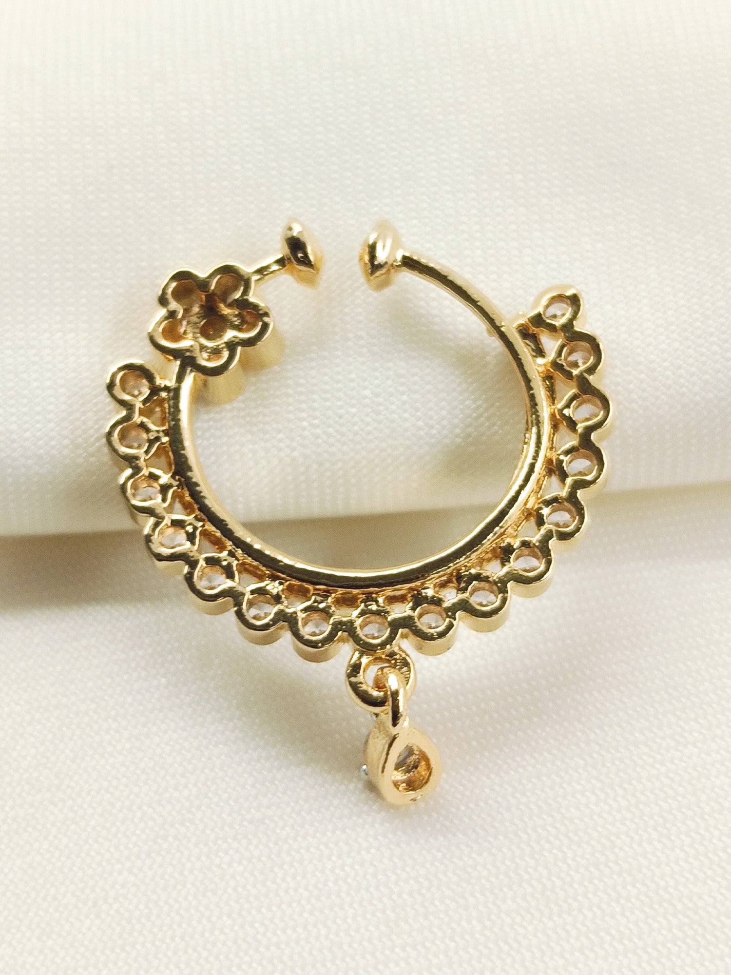 Elevate Your Traditional Look With This Exquisite White American Diamond Nath, Crafted From Premium Gold-plated Brass. The Brilliant White American Diamonds Catch Light Beautifully, Creating A Sophisticated Sparkle That Complements Any Occasion. The Durable Brass Base Ensures Longevity While The Lustrous Gold Plating Adds Warmth And Elegance. Perfect For Weddings, Festivals, Or Everyday Wear, This Nath Seamlessly Blends Classic Charm With Contemporary Design. A Timeless Accessory That Enhances Your Facial Features With Understated Glamour.